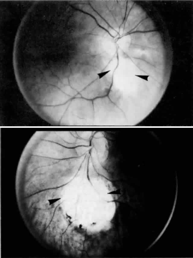 Amalric69 divided the clinical situations in which choroidal triangles occurred into three groups: (1) generalized or systemic vascular processes; (2) localized circulatory obliterations; and (3) choroidal arteriosclerosis. Clinical entities such as malignant hypertension, chronic renal failure, toxemia of pregnancy, collagen vascular diseases (e.g., scleroderma, systemic lupus erythematosus, Raynaud's phenomenon), and vasculitis (e.g., temporal arteritis) are included under the rubric of generalized or systemic vascular processes. Also included are hemorrhage leading to hemorrhagic shock, and hematologic diseases such as polycythemia vera, disseminated intravascular coagulopathy, thrombotic thrombocytopenic purpura, and cryoglobulinemia. Localized circulatory obliterations refer to thromboembolic events and to ischemia resulting from entities such as trauma, infection, or degenerative disease states. Choroidal arteriosclerosis has been related to changes brought on by diabetes and aging. Foulds and co-workers70 presented cases of cranial arteritis documented clinically or clinicopathologically, in which wedge-shaped (triangular) areas of acute retinal edema were associated with visual loss. Recovery of vision occurred with the resolution of the retinal edema and the appearance of pigment clumping in a triangular distribution. The clinical features of these cases were consistent with obstruction of a major branch of one of the short posterior ciliary arteries. Some of their cases of choroidal ischemia showed evidence of choroidal and optic nerve changes. Adjunct studies (hue discrimination and electro-oculography) supported the etiology of outer retinal injury instead of a primary optic neuropathy. Because the optic nerve head is supplied by the short posterior ciliary arteries, as is the choroid, the findings of disturbances in the choroidal flow and optic nerve ischemia could be explained readily. In an attempt to determine whether visual loss in cases of ischemic optic neuropathy could be attributable to retinal damage due to choroidal ischemia as opposed to primary optic nerve damage, Foulds and colleagues70 retrospectively studied 22 cases of ischemic optic neuropathy. Only 4 of the 18 available fluorescein angiograms reviewed showed disturbed choroidal filling and patchy choroidal leakage in addition to the expected leakage at the optic nerve head. Interestingly, of seven interpretable tests of hue discrimination, six were suggestive of choroidal blood-flow disturbances. The fluorescein studies showed that acute disturbances of choroidal blood flow are not common in patients with ischemic optic neuropathy, whereas color-vision testing supported the concept that the visual disturbances occurring in patients with ischemic optic neuropathy arose from choroidal vascular lesions rather than a defect in optic nerve conduction. The authors concluded that choroidal blood-flow disturbances probably play a role in the symptomatology of ischemic optic neuropathy. Funduscopic changes in the retina resulting from malignant hypertension are well characterized and include arteriolar constriction, papilledema, retinal detachment, retinal hemorrhages, and cotton wool spots (i.e., nerve fiber layer infarcts). The retinal findings of malignant hypertension tend to overshadow the acute vaso-occlusive choroidal lesions that often accompany systemic hypertension and play a role in the pathogenesis of retinal detachment. In evaluating the role of acute ischemic infarcts of the choroid in retinal detachment associated with systemic hypertension, Klien71 described the following histologic changes in the choroid: