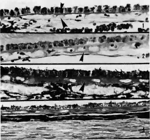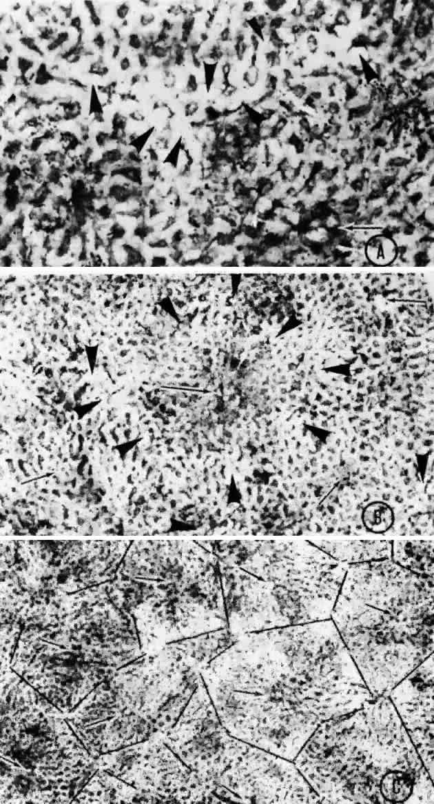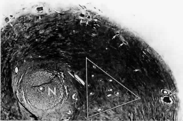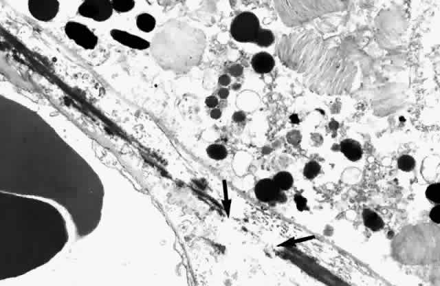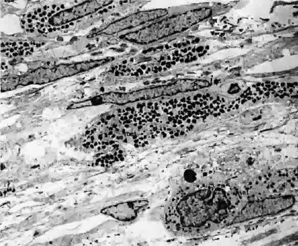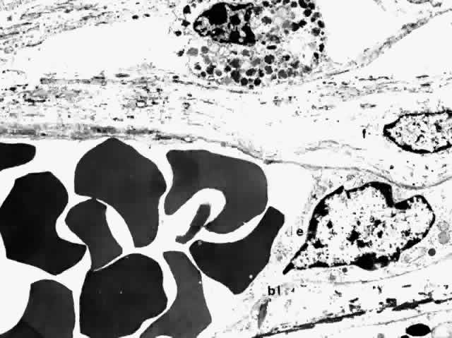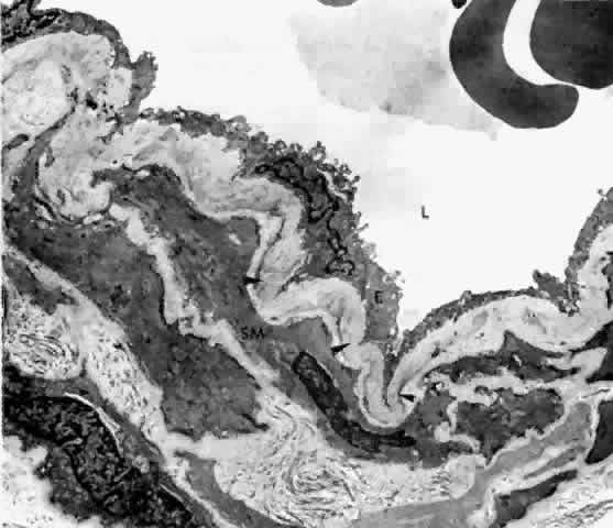 The nuclei of the smooth muscle cells are cigar shaped and often contain one or two nucleoli. The cytoplasm contains mitochondria, smooth and rough endoplasmic reticulum, pinocytotic vesicles along the surface of the membrane, and many myofilaments (Fig. 20). The filaments are long and parallel to each other. Dense, osmiophilic thickenings on the myofilaments may represent Z bands where the filaments fix for contraction.17 As the arteries diminish in caliber, they become arterioles, which have only an intermittent layer of smooth muscle cells and no internal elastic lamina. The adventitia is continuous with collagen fibers in the intervascular spaces. The endothelium is continuous, and the cells are covered by basement membrane. There is more collagen around the precapillary arterioles than around the postcapillary venules.