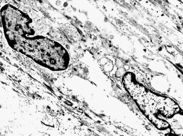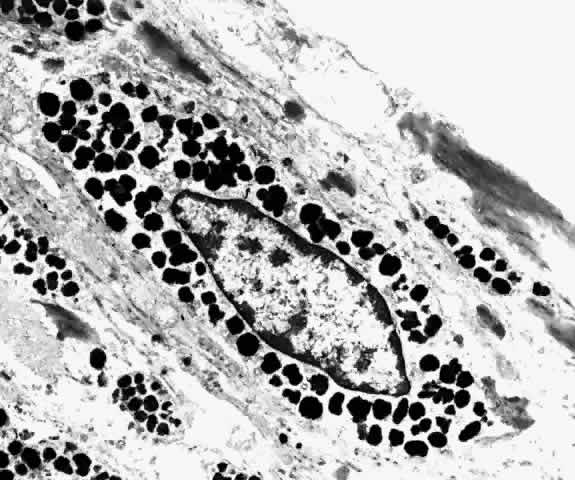 The melanocytes in the middle choroidal layers are star shaped, the cell bodies smaller, and the processes long and thin, stretching out as tentacles from the cell body. The processes connect with cells in adjoining layers but do not seem to plunge deeply across several lamellae into the more inner layers. The melanosomes, 0.3 to 0.4 μm in diameter, are all about the same size in a given person, and are fine and evenly distributed in the cytoplasm.52 The melanin granules are lighter brown and smaller than in the RPE. The cytoplasm also contains free ribonucleic acid granules, a few mitochondria, Golgi apparatus, rough endoplasmic reticulum, vesicular and lamellar elements, and centrioles. Some melanocytes contain many mitochondria and smaller melanin granules, less than 0.2 μm in diameter.5 Freeze-fractured melanocytes reveal melanosomes as membrane-limited organelles with a uniform, finely divided, particulate inner structure and no discernible internal arrangement.63 The fibrocyte is the most common nonpigmented cell found in the choroid (Fig. 31). Its long, spindle-shaped body and processes intermingle with the melanocytes in the outer choroid, forming syncytia. They are present throughout the vessel layers and only rarely are seen in the subcapillary zone of collagen. The cytoplasm of the fibrocyte contains mitochondria, Golgi apparatus, centrioles, free ribosomes, and rough endoplasmic reticulum.17,22