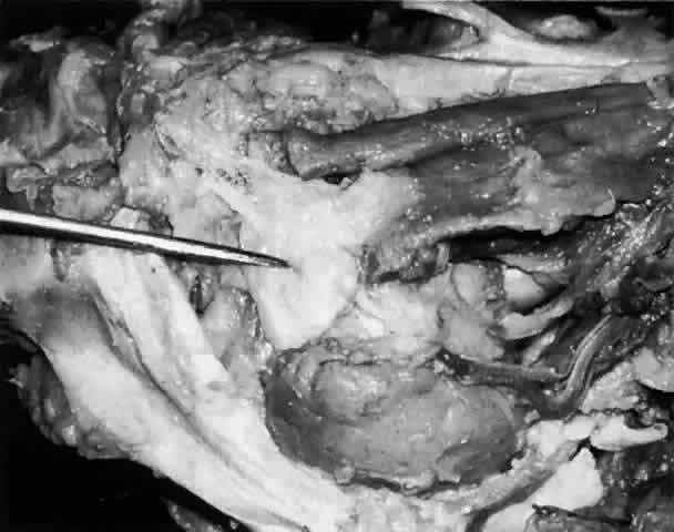 The caliber, length, and course of the nasolacrimal canal vary considerably. The canal is slightly oval, having the greatest dimensions in the anteroposterior plane. The length of the canal is 12 to 13 mm with a slightly lateral convexity. The canal inclines posteriorly (Fig. 30) approximately 15° from vertical as the canal descends from the lacrimal fossa to the nose.28 Clinically, the lateral descent of the nasolacrimal canal can be estimated by drawing a line between the tear sac and the ala nasae. Persons who have narrow interorbital distances and wide noses have the greatest lateral descent, whereas those with wide interorbital distances and narrow noses show a more vertical descent.1,2