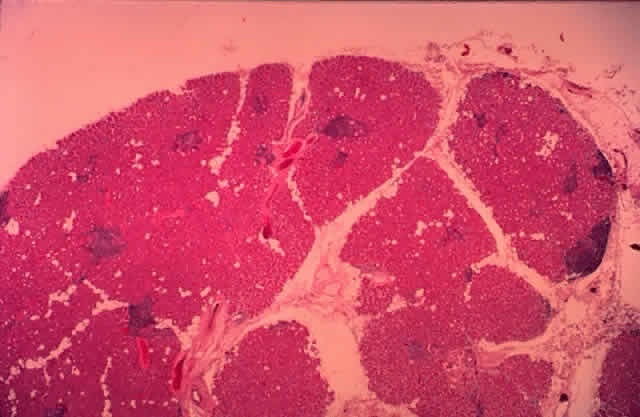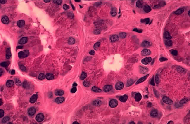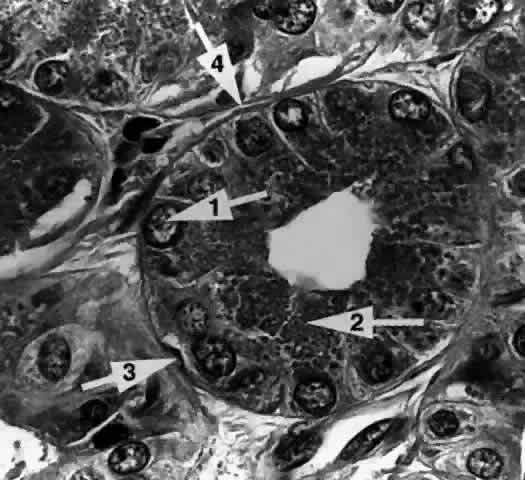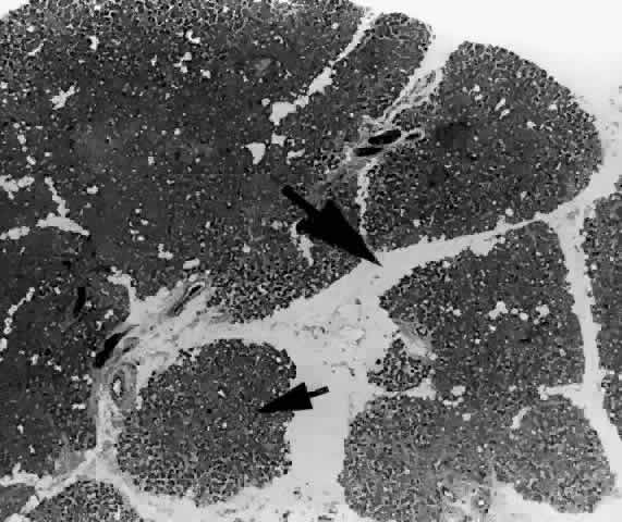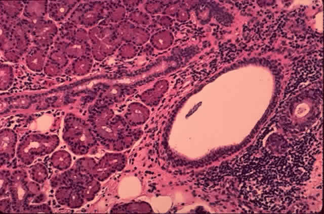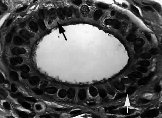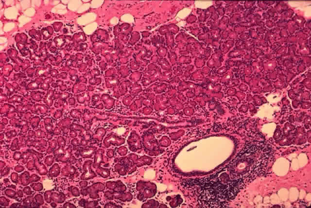 The facial nerve supplies parasympathetic secretory fibers to the lacrimal gland. They arise from the lacrimal nucleus near the facial nucleus in the caudal pons. They emerge from the ponsmedullary junction between cranial nerves VI and VIII. The facial nerve passes into the internal auditory meatus and extends to the geniculate ganglion, where the nerve cells of the preganglionic parasympathetic fibers lie. The greater superficial petrosal nerve arises from the preganglionic parasympathetic fibers of the geniculate ganglion and course back into the middle cranial fossa to join with the great deep petrosal sympathetic nerve from the internal carotid plexus, forming the nerve of the pterygoid canal (Vidian nerve). Parasympathetic fibers pass into the sphenopalatine ganglion and synapse. From there, postganglionic parasympathetic fibers can pass either directly to the lacrimal gland or, more commonly, along with the communicating branch of the zygomaticotemporal nerve (a branch of the maxillary nerve) to anastomose with the lacrimal nerve. The postganglionic cervical sympathetic fibers rise from the superior cervical ganglion and travel along with the internal carotid arteries (carotid plexus), to reach the lacrimal gland by way of the deep petrosal nerve, the nerve of the pterygoid canal, the sphenopalatine ganglion, and then the zygomaticotemporal nerve. A communicating branch to the lacrimal nerve from the zygomaticotemporal nerve provides sympathetic and parasympathetic innervation. Other sympathetic fibers may pass directly from the carotid plexus to the trigeminal nerve and then to the lacrimal nerve. Other sympathetic nerve fibers are contiguous with the lacrimal artery. It appears that the trigeminal nerve forms the sensory (afferent) pathway and the facial nerve the parasympathetic (efferent) pathway for reflex secretions of the main lacrimal glands.8 HISTOLOGY OF THE LACRIMAL GLANDS Arrangement Each lobe of the lacrimal gland is separated into numerous lobules by interlobular fibrovascular connective tissue (Fig. 11). Each lobule, as seen by light microscopy, is composed of two units (Fig. 12): (1) the acinar unit (or secretory unit); and (2) the ductal system. The acinar units are further separated by intralobular fibrovascular connective tissue. The Acinar Unit (Fig. 13) Each lobule consists of a complicated grape-like (Fig. 14) arrangement of acini. Each acinar unit (Fig. 15) consists of a central lumen, a continuous inner layer of columnar secretory epithelial cells, and a surrounding interrupted outer layer of irregularly shaped myoepithelial (basket) cells.9 The acinar secretory cell typically has a basally located nucleus with one or two nucleoli, as seen with electron microscopy. The predominant structures in its cytoplasm are the numerous zymogenic secretory granules located mainly in the apical or midportions of the cell9 (see Fig. 15). The secretory granules vary in shape from round to oval and have a surrounding membrane. The secretory granules vary in electron density from homogeneous (electron-dense) to finely granular (less electron-dense).10 The number of granules in the cytoplasm varies from cell to cell. The size of the secretory granules also varies, the larger ones being located in the more peripheral portion of the lobule. Although chemical studies show that the secretory granules of the lacrimal gland contain both serous proteins and mucous polysaccharides, the predominance of dense granules containing protein suggest that the serous type of secretion is the primary function of the lacrimal glands.11 The mechanism by which the zymogenic granules are discharged into the lumen of the acinus is thought to be emiocytosis,12 a process where the limiting membrane of the granules fuses with the apical cell membrane, after which the granular contents are released into the lumen. Other cytoplasmic structures include cisternae of roughsurfaced endoplasmic reticulum and the Golgi complex. The cytoplasm also has mitochondria, free ribosomes, lipid droplets, and dispersed tono-filaments.11–13 The luminal surface of the secretory cell has microvilli, whereas the basal surface of the secretory cell is in direct contact with the surrounding basement membrane or in contact with an interspersed myoepithelial cell.10,14,15 Myoepithelial cells (see Fig. 15) appear as flattened, stellate, or spindle-shaped cells interspersed in the basal part of the acinar wall, between the secretory cells and the basement membrane. They are characterized by the presence of cytoplasmic myofilaments. The myofilaments consist of actin-type filaments in a parallel fashion, in some areas resembling fusiform smooth muscle.9,11 A thick, often multilayered basement membrane (see Fig. 15) surrounds the outer surface of the acinus, separating it from the intralobular connective tissue. Collagen fibrils, capillaries, unmyelinated nerve fibers, fibroblasts, plasma cells, and lymphocytes can be found within this connective tissue. The plasma cells have been shown to produce IgA, an immunoglobulin typically elaborated at mucosal surfaces. Acetylcholinesterase activity has been found around the acini, particularly adjacent to the myoepithelial cells, suggesting that they are the primary neural target for parasympathetic activity.16,17 The number of acinar units decreases in proportion to increasing age, while the number of fibrous components of the intralobular connective tissue increases.13 The Ducts The ducts (Figs. 16 and 17) are branching structures consisting of a central lumen, a luminal cell layer, and a basal cell layer. There are three types of ducts: (1) intralobular ducts, (2) interlobular ducts, and (3) the main excretory ducts. Serous secretion from the acini drain through the small intralobular ducts, then through the larger interlobular ducts, and eventually into the main excretory ducts of the lacrimal glands before draining into the superior lateral aspect of the conjunctival fornix. All th