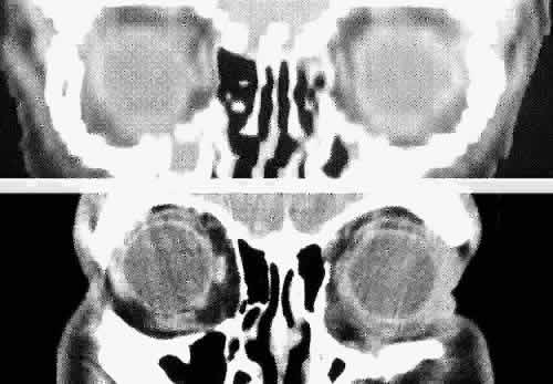 Multiplanar reconstructions are frequently used to provide imaging in the coronal, sagittal, and oblique planes in both orbital and cranial CT.12–14 As already noted, multiplanar reconstruction is also required for the formation of 3D images.8 These reconstructions are computer-generated from consecutive or overlapping transverse images, with the reconstructed image based on the volume (i.e., the individual voxels) of the tissue slice scanned. The resolution of these images depends on the number of slices imaged and their thickness and on the extent to which individual slices overlap. Multiplanar reconstruction is very useful in patients who cannot remain still for any length of time, who are medically or surgically unstable, who have limited mobility, or who have been injured traumatically, because this technique avoids the repositioning required for direct coronal and sagittal scanning and reduces the time needed to obtain a scan. This technique is also quite helpful when dental or other metallic appliances are present, because these items reflect or disperse radiation, resulting in significant imaging artifacts. Direct multiplanar CT imaging provides a much improved image over those obtained through multiplanar reconstruction (Fig. 4). This technique is “slice-oriented” in that each image is obtained directly by scanning in a plane perpendicular to the tissue slice whose image is desired. In contrast, multiplanar reconstruction is “volume-oriented” in that the reconstructed images are based on the total volume of tissue imaged in one particular, usually axial, plane. Direct coronal and sagittal CT scanning requires special patient positioning that may not be possible for all patients.1,5,6,15 However, the images produced by direct scanning have significantly higher spatial resolution and quality than those produced by multiplanar reconstruction. In addition, such direct scans avoid imaging artifacts caused by eyelid and ocular movement that often occur in imaging by multiplanar reconstruction. On the other hand, imaging artifacts caused by dental appliances are often present on direct coronal and sagittal scanning. Generally, direct coronal scanning should be obtained, whenever possible, to supplement axial orbital scans to image this area most accurately (Fig. 5). Direct multiplanar imaging of the orbit and optic nerve is particularly helpful in instances of ocular and orbital trauma and in cases in which evaluation of the extraocular muscles, optic nerve, chiasm, canal, and perisellar or cavernous sinus areas is desired.
