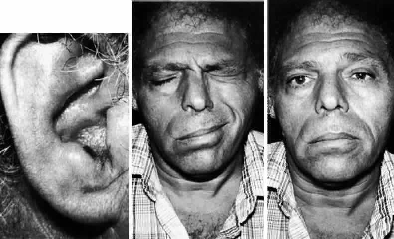 infranuclear segments. DISORDERS OF UNDERACTIVITY Supranuclear Lesions Motor function of the upper face derives from both hemispheres. As a result, supranuclear lesions involving the face will spare the functions of forehead wrinkling and eye closure. Rarely, infranuclear lesions have been described with similar sparing of function, but the accompanying lateralized neurologic findings involving the ipsilateral body usually suggest an obvious supranuclear disturbance.12 In addition to the physical examination, computerized tomographic (CT) and magnetic resonance imaging (MRI) scans allow prompt identification of these lesions. Motor strip or corticobulbar tract lesions are characterized by paresis of volitional movement, with preservation of facial tone and involuntary expressions. These involuntary functions are subserved by extrapyramidal input that originates in the basal ganglia and traverses extrapyramidal pathways to the facial nucleus. When these fibers are damaged in disease states involving the basal ganglia or brain stem (e.g., Parkinson's disease), volitional facial movements usually remain normal, whereas little facial tone or emotional expression is displayed.3,5,15 The list of possible causes of supranuclear facial paresis is large. The major categories of causes are vascular, infectious, demyelinating, and tumorous. Nuclear Lesions (Including Those of the Intrapontine Fascicle) The facial nucleus lies in close proximity to the abducens nucleus and the para-abducens (paramedian) reticular formation. Consequently, patients with nuclear lesions often present with abnormalities of contiguous structures. However, a dissociation between the facial nerve modalities of somatic motor, visceral motor, and sensation can be seen at the level of the pons. FOVILLE'S SYNDROME. Patients with Foville's syndrome display peripheral facial weakness, ipsilateral conjugate horizontal gaze paresis, and contralateral hemiparesis. Lesions associated with these clinical features extend from the facial nucleus to the abducens nucleus and paramedian pontine reticular formation dorsomedially, and into the corticospinal tracts ventrally.20 The paramedian reticular formation can be thought of as the conjugate gaze center of the brain stem, which is why the gaze paresis is conjugate rather than just an ipsilateral abducens palsy. MILLARD-GUBLER SYNDROME. In Millard-Gubler syndrome there is a combination of contralateral hemiparesis, abducens palsy, and variable facial nerve palsy.20 Lesions associated with these clinical features lie more ventrally in the brain stem than those of Foville's syndrome, and they cause an infranuclear abducens palsy rather than a nuclear disruption. Ipsilateral conjugate gaze paresis, as seen in Foville's syndrome, is absent. Although Foville's syndrome and Millard-Gubler syndrome are of historical interest, they represent only signatures of brain stem involvement in which there are varying degrees of nuclear and corticospinal tract dysfunction. Clinically, if a patient has both peripheral facial weakness and eye findings, the presence of a central lesion should be considered and signs of contralateral hemiparesis should be inspected. Stroke and infiltrating tumor are the two most common causes; sudden onset suggests the former and subacute progression the latter. MÖBIUS' SYNDROME. Harlan, writing in 1881, described the first patient. In 1892, Möbius collated a number of cases, bringing greater recognition to the syndrome that now bears his name. Peripheral facial weakness and abduction deficits are central features of this syndrome, and in the majority of cases these findings are bilateral. A host of associated features have been described, including other cranial nerve palsies, ptosis, musculoskeletal abnormalities, cardiac anomalies, craniofacial defects, and mental retardation.21 Nuclear agenesis of nerves VI and VII is considered the classic syndrome, but investigators have found cases in which the abnormality was nuclear, neuropathic, or myopathic.22,23 Furthermore, the etiologies postulated to date include congenital hypoplasias, vasculopathies, genetics, infections, neuronal degeneration, and muscular dystrophy.24–26 Imaging studies in nuclear cases, when positive, have shown brain stem atrophy and caudal pontine calcifications. At necropsy, the calcifications in one patient correlated with necrotic areas.27 Treatment of the facial diplegia associated with this syndrome has been successful. Treatment involves the use of muscle transplants that are innervated by transposition of either cranial nerves V or XII.28 COMPLICATIONS OF AIDS. Supranuclear, nuclear, and infranuclear lesions can also be found in AIDS patients. The meningeal space is a common site of infranuclear involvement. Depending on the clinical location of disease, CT/MRI, cerebrospinal fluid analysis, and serologic tests are very important ways of differentiating possible causes. Consideration should be given to the presence of toxoplasmosis, lymphoma (intraparenchymal and meningeal), neurosyphilis, tuberculosis, fungus (especially Cryptococcus), and viruses (HIV, cytomegalovirus, and progressive multifocal leukoencephalopathy). A study by Keane29 found that 50 of 2030 (2.5%) AIDS patients admitted to the hospital had neuro-ophthalmologic pathology; of these 50 patients, 7 had a peripheral-type facial paresis, all due to lesions of the pontine tegmentum. Infranuclear Lesions When facial weakness is progressive and of a peripheral nature, lesions along the course of the facial nerve must be considered. By testing the various facial nerve functions, these lesions can be clinically localized, and specific neuroradiologic techniques can be used to define further the extent of involvement and suggest a cause. Facial weakness is bilateral in approximately 1% of cases.30 CEREBELLOPONTINE ANGLE LESIONS. As noted above, cranial nerves VII and VIII are enclosed in a common sheath as they leave the brain stem in 