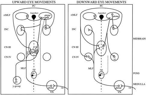 The oculomotor and trochlear nuclei contain the motoneurons for vertical and torsional eye movements. Thus, the substrate for each functional class of eye movements must project to these motoneurons (Fig. 3). On the one hand, vertical and torsional saccades and the mechanism for eccentric vertical gaze-holding are synthesized in the midbrain. On the other hand, vestibular and pursuit signals ascend to the midbrain from the lower brainstem. In the prerubral fields at the junction of midbrain and diencephalon, lies the rostral interstitial nucleus of the medial longitudinal fasciculus (riMLF),73 which has also been called the nucleus of the prerubral fields and the nucleus of the fields of Forel. It contains burst neurons for vertical saccades and quick phases, and for torsional quick phases. Each riMLF contains neurons that burst for both upward and downward eye movements, but for torsional quick phases in only one direction. For example, the right riMLF discharges for quick phases that are directed clockwise with respect to the subject.74 Each riMLF is connected to its counterpart commissural projections. The riMLF projects to motoneurons innervating elevator muscles bilaterally, but to motoneurons innervating depressor muscles ipsilaterally; therefore each riMLF is responsible for innervation of the contralateral superior oblique and ipsilateral inferior rectus muscles for saccades.75,76 Furthermore, each burst neuron in the riMLF sends axon collaterals to motoneurons supplying yoke muscle pairs; this appears to be part of the neural substrate for Hering's law in the vertical plane.77 The riMLF also projects to the interstitial nucleus of Cajal (INC), which has been shown to play an important role in vertical gaze-holding.78 In addition, the INC also receives inputs from the vestibular nuclei.79 The INC projects via the posterior commissure to motoneurons of the contralateral vertical ocular motor subnuclei.80 The INC also contains neurons that project to motoneurons of the neck and trunk muscles, and appears to coordinate combined torsional-vertical movements of the eyes and head. The neural signals necessary for vertical vestibular and smooth pursuit eye movements ascend to INC from the medulla and pons. The MLF is the most important route for these projections but the brachium conjunctivum and other pathways are also involved.81 EFFECTS OF MIDBRAIN LESIONS ON VERTICAL AND TORSIONAL GAZE Experimental unilateral lesions of the riMLF cause a mild defect in vertical saccades, because nucleus on each side contains burst neurons for both upward and downward movements. A right riMLF lesion would also have little effect on upward saccades but downward saccades might be slowed82,83; this asymmetry of vertical defects may reflect the bilateral projections of riMLF to elevator muscles but ipsilateral projections to depressor muscles. However, a unilateral riMLF lesion produces a specific defect of torsional quick phases.82,83 For example, with a lesion of the right riMLF, torsional quick phases, clockwise from the point of view of the subject (extorsion of the right eye and intorsion of the left eye) are impaired. Vertical saccadic deficits with unilateral lesions of the riMLF in humans are rare and often may reflect involvement of the commissural pathways of the riMLF that makes the lesion, in effect, bilateral.82,84 Thus, one reported patient with a unilateral midbrain lesion involving riMLF, but no evidence of commissural involvement, manifested contralesional tonic ocular tilt reaction (see below), torsional nystagmus and impaired vertical gaze, especially for downward saccades that became both limited and slow.85 In general, however, bilateral lesions are required to produce clinically apparent deficits of vertical eye movements.86 Bilateral experimental lesions of the riMLF in monkeys cause a defect of vertical and torsional saccades that may be more pronounced for downward eye movements83,87; vertical gaze-holding, vestibular eye movements and, possibly, pursuit are preserved, as are horizontal saccades. Patients with discrete, bilateral infarction in the region of the riMLF show deficits of either downward or both upward and downward saccades.88 Extensive bilateral PPRF lesions cause slow vertical saccades by impairing the ascending input to the riMLF. Certain metabolic and degenerative disorders may lead to selective slowing or absence of vertical saccades (Table 4). TABLE 4. Causes Of Slow Saccades*