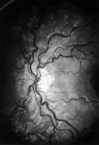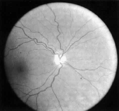 A wide spectrum of abnormalities of the fundus also is often observed.126–128 Optic nerve anomalies are common, mostly consisting of unilateral or bilateral hypoplastic optic nerves that occur in up to half of affected children (Fig. 7).126 Nystagmus and severe visual impairment are present in the most pronounced cases of optic nerve hypoplasia. The retinal vessels, mostly arteries, often are tortuous and exhibit an abnormal width and course over the retinal surface (Fig. 8).125,127