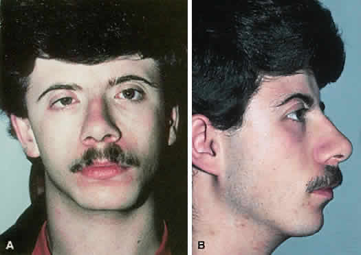Most authors require the presence of periocular choristomas to establish the diagnosis of oculoauriculovertebral dysplasia. The incidence of epibulbar and orbital choristomas ranges from 32% to 92% depending on which study is referenced and how the author chose to define the inclusion criteria.161,162 Upper eyelid colobomas occur in between 12% and 20% of cases and are usually ipsilateral to the side exhibiting the choristema.161 In Mansour and associates' classic study,162 12% of patients had ptosis and 11% had nasolacrimal anomalies including nasolacrimal duct obstruction and lacrimal fistulas. Other ocular findings include horizontal palpebral fissure shortening, eyelid skin tags, and iris colobomas. Strabismus is noted in from 10% to 19% of patients and include Duane's syndrome, esotropia, exotropia, and palsy affecting cranial nerve VI.161–163 Rare occurrences include microphthalmia, anophthalmia, and cataracts.74,162,164–167 Extraocular anomalies in the syndrome are numerous and varied. Middle ear abnormalities, agenesis of the external auditory canal, and preauricular fistulae may be found. Other associated features include micrognathia, macrostomia, microcephaly, hydrocephaly, plagiocephaly, intracranial dermoids, various cranial asymmetries, and various palatal and facial clefts.159,162,165,168,169 Vertebral anomalies include cervical vertebral fusion primarily at the C2-C3 level, hemivertebrae, butterfly vertebrae, and pericervical cartilaginous tags, spina bifida, scoliosis, and hypoplastic or fused ribs.106,109,112,115,116 Cardiopulmonary anomalies include atrial septal, ventricular septal defects, pulmonary stenosis, Tetralogy of Fallot and tracheoesophageal fistula.139,160,170–173 Genitourinary problems, such as horseshoe kidney, have been reported.164 Clubfoot, forearm hypoplasia, and digital anomalies have also been documented.162,165,168,169 The etiology of Goldenhar's syndrome is unknown although an early cell-induction abnormality due to environmental, vascular, or topographic insult has been postulated.127,153 Most cases occur sporadically although both autosomal recessive and autosomal dominant inheritance patterns have been hypothesized in certain cases.74,169,174–176 HEMIFACIAL MICROSOMIA Hemifacial microsomia is a highly variable craniofacial disorder, which, like Goldenhar's and Treacher-Collins syndromes, is related to an abnormal morphogenesis of the branchial arches (Fig. 28).155 This is one of the more common craniofacial abnormalities with an estimated frequency of 1 in 4000 live births.155 The term itself was popularized by Gorlin and Pindborg.177 Other terms include craniofacial microsomia, otomandibular dystosis, and auricular branchiogenic dysplasia. There is a male predominance178 and a positive family history may be seen in 50% of cases.179,180