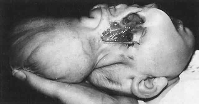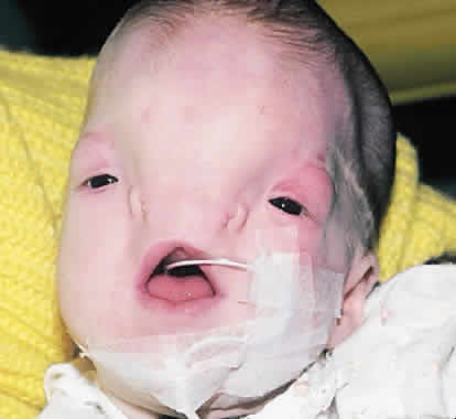 In a study of 49 patients by Hertle and coworkers178 67% of patients had ocular findings. In addition, 16% had visual loss secondary to amblyopia caused by uncorrected refractive errors (27%), anisometropia (8%), strabismus (22%), and nystagmus and ptosis (12%). Limbal dermoids and orbital dermoids are frequently observed in this syndrome158 whereas microphthalmos and anopthalmos are rarely present. Varying degrees of canthal dystopia occur. The orbit is frequently decreased in size and volume. The most common adenexal abnormalities are dacryostenosis and blepharoptosis. Colobomas of the upper eyelid may be found as well as iris colobomas. Common findings include esotropia, exotropia, Duane's syndrome, and several cranial nerve palsies affecting the motility.185 Cataracts, glaucoma, and keratitis sicca also occurred frequently. Many theories have been advanced to explain the etiology of this syndrome. Several features overlap Goldenhar's and Treacher-Collins syndromes such as upper eyelid colobomas and even more importantly, the morphogenic abnormalities of the first and second branchial arches. However, certain skeletal and suspended manifestations help to differentiate hemifacial microsomia from the other first and second branchial arches. These include cerebral, malar, mandibular, temporal, and zygomatic hypoplasia; various cerebral anomalies; a wide variety of cranial nerve abnormalities with the facial nerve most commonly involved; and rare neural and cardiac anomalies.111,186,187 AMNIOTIC BAND SYNDROME Amniotic band syndrome, also known as constriction ring syndrome, is another cause of facial clefting. The clefts in this syndrome are variable and do not conform to any specific pattern. Incidence of this syndrome varies from 1:1,200 to 1:15,000 live births.188 Nearly all cases are sporadic, although a few instances of familial transmission have been reported.189 Distribution by gender and race is equal. Any understanding of the pathogenesis of this syndrome should begin with a review of the normal development of the amniotic sac, which contains amniotic fluid that bathes the developing embryo. The amniotic fluid provides the embryo with constant temperature in a nonrestricted environment as protection against trauma.190 As normal gestation progresses, the amnion thickens, as does the chorion or the semipermeable membrane, which lies deep to the amnion. The fetus begins swallowing amniotic fluid at approximately 3 to 6 months of embryogenesis.188 The etiology of amniotic bands is subject to wide debate. The most likely explanation is related directly to the formation of amniotic bands. Early in the middle trimester, the amnion may separate from the chorion and produce thin free-floating tissue strips. These amniotic bands may wrap around parts of the embryo in a bandlike manner, restricting growth or even causing full structural defects, such as amputation of arms or limbs. Rupture of the amnion not only produces amniotic bands but also reduces levels of amniotic fluid temporarily. As already mentioned, as gestation proceeds the amnion thickens. Thus, separation of the amnion from the chorion at later stages of gestation promotes thicker bands, which are capable of producing more deformities. These amniotic bands may also be swallowed, becoming anchored in the mouth. If this occurs, the bands may stretch across the face and cranium and can interrupt facial fusional processes or create disruption in tissues already formed creating cranial deformities of alarming magnitude (Fig. 29).191 If the band encircles the umbilical chord, it may lead to fetal hypoxia and death. Pericranial constrictions can cause anencephaly or encephaloceles. Clefting defects may be caused by pressure necrosis or interruption of normal fusion in facial processes. Any combination of clefts may arise in this syndrome. Larger bands may also cause intrauterine amputations. In some cases, the amniotic band may be found in the cleft or peripheral constriction defect thus providing some insight regarding the etiology of the deformity. An alternative theory suggests that extrinsic band formation does not occur and that such constrictions, compressions, and clefts might result from focal fetal dysplasia.192 This theory survives because it is difficult to explain certain internal malformations. Associated with this syndrome (dysplastic kidneys, imperforate anus, and ectopic gallbladder).193 As expected, ophthalmic complications may arise from the amniotic band syndrome.194–196 The most common anomaly is colobomas of the eyelids (upper, lower, or both). Associated colobomas tend to be large and irregular and often lead to corneal exposure and other related complications. Symblepharon from the lid to the cornea can be associated with these colobomas. Paramedian clefts (Tessier's numbers 3 and 4) frequently have nasolacrimal system abnormalities, including nasolacrimal duct obstruction, punctal or canalicular agenesis, or even complete absence of the nasolacrimal system. Hypertelorism occurs in approximately 45% of these cases and is often associated with frontal encephalocele in the median or perimedian cleft (Tessier's cleft numbers 0, 1, 2, 12, 13, and 14) Canthal dystopia and ptosis may also be observed. Extraocular muscle abnormalities may include esotropia, exotropia, oblique muscle overreaction, and paralytic strabismus. These strabismus patterns may be primary or secondary to the cranial nerve abnormalities. Less common abnormalities include iris and choroidal coloboma and entropion, ectropion, megalocornea, and varying degrees of myopia and hypertropia. MANAGEMENT OF CRANIOFACIAL DEFORMITIES As mentioned previously, patients with craniofacial deformities require management by a team of specialists, which will usually include consultants from genetics, plastic surgery, neurosurgery, oral surgery, orthodontics, ophthalmology, and otolaryngology, as well as psychiatry, nutrition, speech therapy, and social work. Te