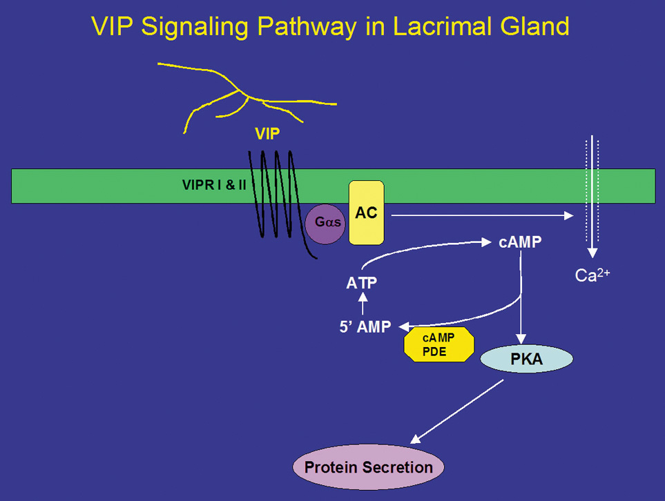 LACRIMAL GLAND AND ACCESSORY GLANDS The exocrine main lacrimal gland is located in the superotemporal orbit in a shallow lacrimal fossa of the frontal bone. It is surrounded by fibrous tissue that is attached superiorly to the frontal bone periosteum. In the adult, the lacrimal gland measures 20 mm by 12 mm by 5 mm and weighs approximately 0.78 g. It is incompletely divided by the lateral horn of the levator aponeurosis into a larger orbital lobe, which comprises 60% to 70% of its total mass, and a smaller palpebral lobe below.1,2 The two lobes are connected by vessels, nerves, and the lacrimal ducts. The orbital lobe lies posterior to the orbital septum and preaponeurotic fat, and anterior to the levator aponeurosis.1 With increasing age, the gland may herniate through a weakened orbital septum, resulting in fullness of the lateral upper eyelid. The palpebral lobe is located posterior to the levator aponeurosis in the subaponeurotic space and directly anterior to the conjunctiva, which is adherent to the posterior aspect of the gland. Medially, Müller's muscle may intervene between the posterior gland and the conjunctiva. Anteriorly, the palpebral lobe may extend beyond the orbital margin to lie in the superolateral fornix, where it may be visible through the conjunctiva with eyelid eversion. The lacrimal gland is divided into numerous lobules, separated by interlobular fibrovascular connective tissue. Each lobule is structurally composed of the acinar unit and the ductal system. Two to six secretory ducts from the orbital lobe of the lacrimal gland pass through the palpebral lobe or along its fibrous capsule, joining with ducts from the palpebral lobe to form 6 to 12 tubules that empty into the superolateral conjunctival fornix 4 to 5 mm above the tarsus.3,4 Excision of the palpebral lobe may therefore interrupt drainage from the orbital lobe. The ducts, lined by pseudostratified, nonkeratinizing squamous epithelium, form a branching pattern within the lacrimal gland. Secretion from the acinar units first drains into the smaller intralobular ducts, proceeds through the larger interlobular ducts, and eventually passes into the main excretory ducts before draining into the superolateral conjunctival fornix. The surface of the ductal lumina contains microvilli, similar to the acinar secretory cells.5,6 The epithelial walls of the larger ducts contain three to four layers of columnar or cuboidal cells, compared with a single layer in the smaller intralobular ducts. Each acinar unit, or secretory unit, of the lacrimal gland is composed of an inner layer of columnar or pyramidal-shaped secretory cells around a central lumen, and a surrounding basal layer of myoepithelial cells. The nucleus is located at the base of the acinar secretory cell, and numerous membrane-bound zymogenic secretory granules are present in the apical cytoplasm.7 The number and size of granules, which contain predominantly serous proteins for secretion, vary from cell to cell. Typically, larger granules are located in the peripheral lobules.6,8 The zymogenic secretory granules fuse with the apical cell membrane and release their granular contents into the acinar lumen through a mechanism known as emiocytosis.5,6,9 Myoepithelial cells are spindle- or basket-shaped cells, composed of cytoplasmic myofilaments, located between the base of the secretory cell and the basement membrane of the acinar unit.7 Contraction of the myoepithelial cells helps drive secretions into the drainage tubules and ducts. Accessory lacrimal glands are located in the conjunctival fornices and along the superior tarsal border. There are approximately 20 to 40 accessory glands of Krause in the superior conjunctival fornix. There are approximately half the number of glands of Krause present in the lower eyelid as in the superior conjunctiva. Accessory glands of Wolfring, which are slightly larger, are located along the superior tarsal border in the upper eyelid, with 4 to 20 located in the upper eyelid, and 2 to 4 in the lower eyelid.1,3,10,11 The accessory lacrimal gland lobules empty onto the conjunctiva surface through small branching ducts that drain into a single excretory duct that is lined by one or two layers of cells.11 Like the main lacrimal gland, the accessory lacrimal glands are also innervated. Parasympathetic and sympathetic nerves have been identified in accessory lacrimal glands of humans.11–14 The presence of nerves suggests that secretion from accessory lacrimal glands is neurally regulated. Therefore, the accessory lacrimal glands can also contribute to stimulated tear secretion. INNERVATION OF THE SECRETORY SYSTEM The lacrimal gland receives innervation from cranial nerves V and VII, as well as from the sympathetics of the superior cervical ganglion.15 The lacrimal branch of the ophthalmic division of the trigeminal nerve carries sensory stimuli from the lacrimal gland, with the cell bodies located within the Gasserian ganglion. Afferent sensory fibers exit the posterior aspect of the lacrimal gland, travel along the superior border of the lateral rectus muscle, and exit the orbit through the superior orbital fissure. Parasympathetic secretomotor fibers originate in the lacrimal nucleus of the caudal pons and exit the pontomedullary junction between cranial nerves VI and VIII. The fibers enter the internal auditory canal and travel a long course within the nervus intermedius, the greater superficial petrosal nerve, the deep petrosal nerve, and the vidian nerve to finally synapse in the pterygopalatine ganglion.4 The greater superficial petrosal nerve arises from the preganglionic parasympathetic fibers of the geniculate ganglion. The deep petrosal nerve carries sympathetic fibers from the internal carotid plexus. Postganglionic parasympathetic fibers leave the pterygopalatine ganglion through the pterygopalatine nerves to innervate the lacrimal gland.16,17 Some fibers may join the zygomatic nerve as it branches from the maxil