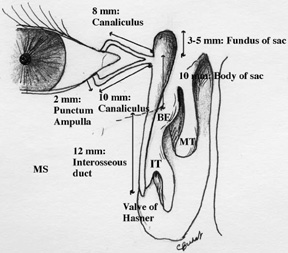 LACRIMAL DRAINAGE SYSTEM Anatomy The lacrimal excretory system begins with a 0.3-mm opening on the medial portion of each eyelid, termed the punctum.3,87 Because of more rapid growth of the maxilla compared with the frontal bone during embryologic development, the lateral migration pulls the inferior canaliculus laterally.88 This results in the lower eyelid punctum to be located approximately 1.0 mm lateral to the upper eyelid punctum.89 Both puncta are directed posteriorly to appose the lacrimal tear lake. Causes such as horizontal eyelid laxity, disinsertion of the inferior retractors from the tarsus, cicatricial shortening of the anterior lamella of the medial eyelid, or trauma may interfere with the precise apposition of the puncta to the lacrimal lake, and thus affect normal functioning of the excretory system. The punctal opening widens into the ampulla, which is 2 mm in height and directed perpendicular to the eyelid margin, before making a sharp turn into the canaliculi. The ampulla, with a diameter of 2 to 3 mm, is the widest part of the proximal drainage system, and thus a common site for formation of dacryoliths. The canaliculi measure 0.5 to 1.0 mm in diameter and run parallel to the eyelid margins. The superior canaliculus is shorter, measuring 8 mm in length, and the inferior canaliculus measures 10 mm (Fig. 6). The canaliculi are lined with 6 to 12 layers of nonkeratinizing, stratified squamous epithelium and surrounded by superficial pretarsal orbicularis oculi muscle as they traverse the medial eyelids and medial canthal region. The deep portion of the pretarsal orbicularis muscle (Horner-Duverney muscle, tensor tarsi, or pars lacrimalis) is important in lacrimal outflow. It passes posterior to the lacrimal sac and the posterior limb of the medial canthal tendon, and inserts onto the upper posterior lacrimal crest.3,87,90 The orbital septum inserts along or just posterior to the inferior posterior lacrimal crest. The deep head of the preseptal orbicularis oculi muscle (Jones' muscle) attaches to the lacrimal sac and lacrimal fascia (Fig. 7).91