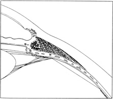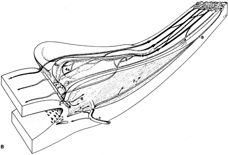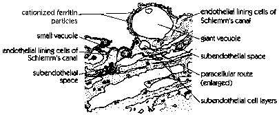The uveal meshwork consists of small, round criss-crossing, interlocking, and branching bands (trabeculae) approximately 4 mm in diameter (Figs. 1 and 13), which tend to be radially oriented. The bands or chords consist of a single layer of endothelial cells surrounding a core of collagen. The spaces between the chords are irregular and range from 25 to 75 μm across. The chords are arranged in layers, or lamellae, but the layers are interconnected. Occasionally, some of the lamellae bridge across the ciliary body face in the angle recess to attach to the root of the iris and form an iris process.4,477,480 The trabeculae of the corneoscleral meshwork are more like broad, flat, endothelium-lined sheets, which tend to be progressively oriented in a circumferential pattern (Figs. 1 and 13). They are 3 to 20 μm in length, and are arranged in bands running around the angle. The spaces between the trabeculae are much smaller than in the uveal meshwork (10 to 30 μm) and are more elliptical. The spaces of adjacent lamellae are not behind one another but are offset, providing a rather convoluted passageway from internal to more external lamellae. Furthermore, as the lamellae approach Schlemm's canal, the spaces become 1 to 2 μm.481,482 The juxtacanalicular or endothelial meshwork, which separates the corneoscleral meshwork from Schlemm's canal is composed of a ground substance of connective tissue, incorporating glycoproteins and glycosaminoglycans. The trabecular meshwork forms the major site of resistance to aqueous outflow, that is, 60% to 80%.483 Removal of the trabecular meshwork from enucleated perfused human eyes results in a 75% or greater decrease in outflow resistance.270,484–490 The question of the exact site of resistance to aqueous humor outflow has significance for delineating the pathophysiology of POAG. Unfortunately, to date, the exact mechanism of aqueous humor outflow and site of resistance remain elusive. It is assumed that the aqueous easily percolates through the large spaces of the uveal meshwork and through the larger openings of the inner corneoscleral meshwork. The resistance to aqueous outflow is believed by most investigators to be located largely in the juxtacanalicular connective tissue, which has a covering of a single layer of endothelial cells on the side facing Schlemm's canal (the juxtacanalicular cells).491,492 Some investigators feel that the main resistance may lie slightly proximal to the juxtacanalicular tissue.493–495 Separation of the basal lamina cells lining of the inner wall of Schlemm's canal from the underlying juxtacanalicular tissue as seen using quick-freeze/deep-etch electron microscopy may represent flow pathways.496 Under normal conditions, the inner wall of Schlemm's canal and juxtacanalicular cells may be in a contracted state, limiting the routes available for fluid flow as demonstrated with gold particle infusion studies in nonhuman primates.497,498 Expansion of the area available for fluid drainage can increase the rate of fluid outflow.497,498 The accompanying loss of extracellular material may not be responsible for the decrease in resistance to fluid outflow.496–499 Aqueous humor enters Schlemm's canal inner wall endothelial cells via 1.5-μm passages.500,501 Vesicles and large vacuoles are frequently seen in the endothelium of the inner wall of Schlemm's canal (Fig. 14).491,501–504 The vacuoles may be as large as 5 by 14 μm. Their function is as yet unknown, but there is much speculation on the subject. Some have felt them to be an artifact, whereas others have suggested that these vacuoles serve a role in the exit, by bulk flow, of fluid and large molecules from the trabecular meshwork into the canal.505,506 Such vacuoles are also found in the arachnoid villi, and are involved in the drainage of cerebrospinal fluid.507 Tripathi508,509 postulated that these giant vacuoles alone serve as a transcellular pathway for aqueous flow across the inner wall of Schlemm's canal. Based on electron microscopic studies using ferritin as a tracer, Cole and Tripathi510 calculated that endothelial vacuoles constantly discharging their contents into Schlemm's canal have enough volume to account for the entire aqueous outflow. While this view is not universally held,511 these vacuoles undoubtedly provide a channel across which some aqueous and large particulate matter flow. This pathway has also been elegantly demonstrated by others,491 showing that red and white blood cells, as well as latex particles up to 1 μm in diameter, entered Schlemm's canal by way of the vacuoles (Fig. 15). Grierson and Lee512 showed that as pressure increased within the physiologic range, vacuolization of the endothelium of Schlemm's canal increased, but that pressures above the physiologic range produced actual occlusion of Schlemm's canal by distension of the corneoscleral meshwork and prolapse of the endothelium. Most giant vacuoles have short survival time once perfusion pressure decreases to zero, suggesting they can respond rapidly to IOP changes.513 Giant vacuoles may not be real intracellular vacuoles but rather dilatations of paracellular spaces.511 Pores of 0.8 to 1.8 μm were also present in nonvacuolated endothelial cells.491 Why endothelial cells should have tight junctions between them but pores within them is difficult to reconcile. Bill and Svedbergh514 have shown that the endothelial cells have a total of 20,000 pores with diameters of up to 3 μm, and that calculations based on this reveal that the pores could be responsible for all the bulk aqueous flow. Pores of the inner wall endothelium are thought to generate at most 10% of the resistance to aqueous humor outflow in humans. Pores of the inner wall cause a funneling effect in which aqueous humor flows preferentially through those regions of the juxtacanalicular tissue.515 However, the possibility that inner wall pores are fixation-induced artifacts cannot be excluded.516 Decreasing the tempera
