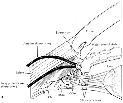 joins the scleral spur and ciliary muscle. The inner portion of the