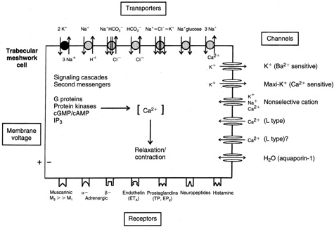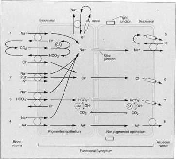 active secretion.1 Another way of testing for the presence of an active metabolic process is to apply specific metabolic inhibitors to the ciliary body and observe the effect on aqueous secretion. Ultrafiltration of fluid from the plasma to the posterior aqueous has been suggested to be responsible for approximately 70% of aqueous formation.27,33,34 However, the results of experiments where metabolic inhibitors have been used have shown conclusively that this is not the case. For example, systemic35 or intravitreal injection36 of ouabain (an inhibitor of the enzyme sodium potassium-activated adenosine triphosphatase [ATPase]—Na+/K+ ATPase) results in a decrease of up to 70% in aqueous formation, in a variety of species. The topical administration of vanadate (also a Na+/K+ ATPase inhibitor) lowers aqueous secretion in rabbits37,38 and monkeys.39 Ouabain as well as a number of other ion transport and channel blocking drugs significantly reduce aqueous humor formation in arterially perfused bovine eyes. Bumetanide (a specific inhibitor of Na-K-2Cl cotransport) and furosemide (a nonspecific anion transport inhibitor) reduce aqueous humor formation by 35% and 45% in bovine eyes in vitro. Similarly, 4,4'-diisothiocyanatostilbene-2,2'-disulfonic acid (DIDS, a probable inhibitor of the Cl-HCO3 exchanger, the Na-HCO3 cotransporter, and chloride channel) and 5-nitro-2-(3-phenylpropylamino)-benzoic acid (NPPB, a chloride channel blocker in nonpigmented cells) reduce aqueous humor formation by 55% and 25%, respectively, in bovine eyes in vitro.40 Also, catecholamines such as epinephrine, norepinephrine, isoproterenol and dopamine, that stimulate aqueous humor formation in humans also stimulate Na-K-Cl cotransport.41 If the greatest proportion of aqueous secretion was attributable to ultrafiltration, then this would not occur. In addition, Bill22 noted that the hydrostatic and oncotic forces that exist across the ciliary epithelium–posterior aqueous interface would favor resorption, not secretion, of aqueous humor. The ciliary process stroma has an oncotic pressure of approximately 14 mm Hg, because of its protein content. Because IOP in the healthy eye is maintained at approximately 15 mm Hg, a capillary hydrostatic pressure of greater than 29 mm Hg would be required to drive an ultrafiltrate. Capillary hydrostatic pressure in the ciliary stroma has been estimated to be 25 to 33 mm Hg.14 It has been calculated27 that a capillary pressure of greater than 50 mm Hg would be necessary to promote ultrafiltration as the major mechanism for the secretion of aqueous. The values of capillary hydrostatic pressure in the ciliary processes and a consideration of the hydrostatic and oncotic forces involved do not favor ultrafiltration as an important mechanism for aqueous humor secretion. Acetazolamide, and other specific inhibitors of the enzyme carbonic anhydrase, decrease the formation of aqueous by 40% to 60%.42–44 A reduction in temperature, which inhibits most active metabolic processes, also results in a decrease in aqueous formation, to a greater extent than would be expected if only diffusion were operating.1,45 Active transport systems usually exhibit a limit beyond which an increase in substrate concentration produces no further increase in transport. When this limit is reached, the system is said to be saturated. Thus, the fact that a transport mechanism for a substance can be saturated provides evidence of an active system. It has been demonstrated that by increasing the ascorbate concentration in plasma, a level of plasma ascorbate is reached above which no further increase in aqueous ascorbate concentration will occur. This provides evidence that the ascorbate transport system in the eye is saturable. Several membrane active transport systems have been identified in the ciliary epithelium that are known to pump various substances against a concentration gradient, including Na+/K+ ATPase and amino acid membrane transporters (Fig. 8). There are also passive transport proteins specific for HCO3− and Cl−. Membrane-bound Na+/K+ ATPase is one important system involved in Na+ and K+ transport and is present mainly along the lateral cellular interdigitations of the nonpigmented ciliary epithelium.35,46–51 The transmembrane Na+/K+ transport protein is energized by the Gibbs free energy of hydrolysis of ATP, mediated by the ATPase enzyme intimately associated with it in the membrane. The ATP required for this process is derived predominantly from oxidative metabolism of glucose via the Krebs' citric acid cycle. It is most likely that Na+ is pumped across the cell membrane and Cl− is passively carried with it in order to maintain electrical neutrality, although the relative rate of transport of Cl− is unclear.52 The Na+ pump induces a potential difference across the ciliary body, ranging from 6 to 10 mV. Measurements of the potential difference across the ciliary epithelia indicate that the aqueous is positive with respect to the stroma. The magnitude of this potential difference is reduced after poisoning with ouabain.53 These data are consistent with the hypothesis that Na+ is the primary mover and that active transport of Cl− is probably small in comparison to that of Na+.54 Interspecies differences in the aqueous-plasma ratios of Cl− (e.g., high in human, low in rabbits) might be explained by the relative proportions of Cl− actively transported.55 Transepithelial electrical measurements in the isolated rabbit iris-ciliary body indicate that Na+/K+ ATPase and HCO3− are required for active ion transport.56 However, recent studies suggest that active transport of Cl− ions plays an equally important role 40,41,57 providing the driving force for aqueous humor formation.57 Shahidullah et al40 found that in the isolated bovine eye, aqueous humor is formed mostly by processes involving active secretion and chloride transport. Recently, it has been discovered that water transport across