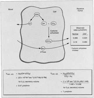 carbonic anhydrase, the enzyme that forms HCO3− (the body's alkaline ion) from CO2 and H2O61–65 by the following reaction: CO2 + H2O → H2CO3 → H+ + HCO3− Carbonic anhydrase catalyzes step I of the reaction and step II is an almost instantaneous ionic dissociation.66,67 The enzyme is localized in both the pigmented and the nonpigmented epithelial cells of the rabbit ciliary processes,68,69 and monkey and human pigmented and nonpigmented epithelial cells,70 most prominently in the basal and lateral membranes, but also in the cytoplasm. A variety of carbonic anhydrase inhibitors will reduce aqueous secretion, including acetazolamide,71 methazolamide, methoxazolamide, ethoxzolamide, dichlorphenamide,72,73 aminozolamide,74 trifluormethazolamide,75 6-hydroxyethoxzolamide,76 dorzolamide,77–79 brinzolamide,80–82 and several biscarbonylamidothiadiazole compounds.44 The site of action of these drugs is intraocular rather than systemic, because the unilateral injection of acetazolamide into the carotid artery lowers the IOP of only the ipsilateral feline eye.83 Precisely how carbonic anhydrase helps mediate aqueous secretion has been a long-standing debate. However, in recent years many advances in understanding of this system have been achieved. In the past, it was suggested that acetazolamide caused constriction of afferent iris or ciliary arteries, thereby decreasing ultrafiltration and hence aqueous humor formation.84,85 However, this view is no longer held. For example, Bill,86 using radiolabeled microspheres, concluded that acetazolamide had no significant effect on the blood flow in the intraocular tissues in the rabbit eye, and that it was unlikely that the drug had any effect on blood flow in the anterior uvea. It has now been irrefutably demonstrated that acetazolamide exerts its ocular effects via a reduction in aqueous secretion, mediated by a direct effect on the ciliary epithelial cells.26 The ciliary carbonic anhydrase system is now thought to function as described by Maren.87 Inhibition of the enzyme decreases the rate of Na+ and HCO3− transport into the posterior chamber by equimolar amounts, indicating a linkage of the accession of these two solutes into the posterior chamber of dogs and monkeys.88 Furthermore, inhibition of carbonic anhydrase lowers the aqueous Cl− concentration in primates and the HCO3− concentration in rabbits.24,89 The mechanism by which carbonic anhydrase activity is coupled to Na+ and HCO3− movement into the posterior chamber is still subject to much study. However, it is now known that the primary reaction, which occurs within the cytosol of the nonpigmented ciliary epithelial cells, is the proteolysis of water to yield OH− and H+ ions (Fig. 9). The hydroxide ions so formed react with CO2 catalytically (or noncatalytically when the enzyme is inhibited) to form HCO3−, which is passively transported to the aqueous humor, simultaneously with the active transport of Na+. The protons liberated from water pass into the blood circulation where they are buffered by proteins. The theoretical rates of flow of HCO3−, based on known constants and some assumptions regarding cell volume and pH of the secretory region, are shown at the bottom of Figure 9. The catalytic rate (i.e., when active carbonic anhydrase is present) is 7 μmol/min, and the uncatalyzed is 0.07 μmol/min. The uncatalyzed rate is found experimentally by inhibiting the enzyme in vivo by a large dose of acetazolamide or similar compound. Such inhibition, when complete, should yield the uncatalyzed rate of HCO3− formation. Measurements obtained experimentally indicate that the observed inhibited rate (Fig. 9; 0.024 μmol/min) is not different from the calculated uncatalyzed rate of 0.07 μmol/min. Considering the assumptions about pH and cell volume, the difference between the calculated and experimentally measured inhibited rates of bicarbonate flow lies within acceptable limits of error. Inhibition of the flow of bicarbonate also leads to an inhibition of the flow of Na+. Several hypotheses have been put forward to explain this: (i) inhibition of carbonic anhydrase causes a decrease in HCO3− available for movement with Na+ to the aqueous side to maintain electroneutrality; (ii) a reduction in intracellular pH may inhibit Na+-K+ ATPase; and (iii) decreased availability of H+ produced by the reaction catalyzed by carbonic anhydrase decreases H+/Na+ exchange and reduces the availability of intracellular Na+ for transport into the intercellular channel. A large excess of carbonic anhydrase has been found in the ciliary processes of all species studied. This has pharmacologic implications when one hopes to reduce aqueous secretion by inhibition of the enzyme. In order to achieve a clinically useful reduction in secretion and hence IOP, more than 99% of the enzyme must be inhibited. The sulfonamide carbonic anhydrase inhibitors have been in clinical use for glaucoma since 1955, when their action on the eye was discovered as an offshoot of their development as diuretics.73 They have also been extremely useful in research on aqueous humor formation, because they are highly specific, having no other actions at concentrations below 1 μM. One major compound is acetazolamide but many ophthalmologists have used methazolamide or related compounds, which have a greater diffusibility than acetazolamide, and that act on the eye in lower doses, thereby achieving the desired ocular effect but having lesser action on other systems in the body where carbonic anhydrase is present, such as the secretory epithelia of the kidney.42 Nonetheless, the systemic dose of sulfonamide carbonic anhydrase inhibitors necessary to significantly suppress aqueous secretion leads to undesirable side effects, even with methazolamide.90 In recent years topically applied carbonic anhydrase inhibitors have been developed for clinical use. Dorzolamide has been used since 199580,91,92 and brinzolamide since 1998.80