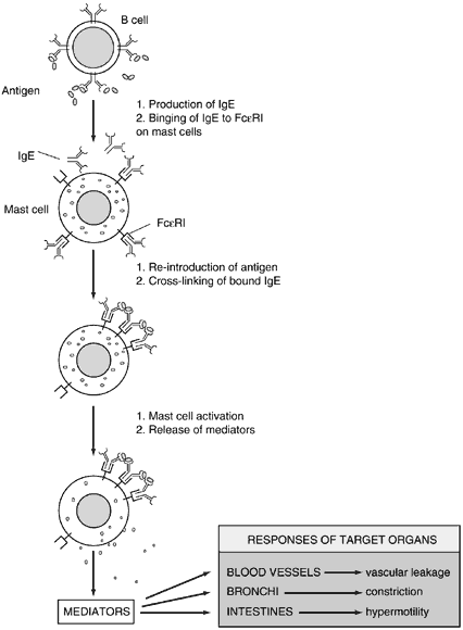 Newly synthesized mediators (see Table 2) include lipid-derived molecules and cytokines. The lipid-derived mediators consist of (1) the prostaglandins synthesized from arachidonic acid via the cyclo-oxygenase pathway; (2) the leukotrienes, also derived from arachidonic acid by the action of 5-lipoxygenase; and (3) PAF. These mediators act locally as direct vasoconstrictors or smooth muscle constrictors and have been recognized as being of primary importance in tissue inflammation. The inhibition of these pathways by new therapeutic agents may prove to be an effective adjunct in controlling both immune and nonimmune-mediated inflammation.1 Over the past few years, it has become evident that cytokines represent the major medium by which cells communicate. The number of cytokines known to us continues to increase, and the complexity of cell-cell interaction is apparent. Mast cells are significant sources of cytokines including TNF, IL-1, IL-4, IL-5, IL-6, IL-3, and granulocyte macrophage-colony-stimulating factor (GM-CSF). These mediators clearly play a role in the late-phase reaction and account for the recruitment of other inflammatory cells to the site of reaction. IL-4, in particular, is responsible for the eosinophilic infiltrate typically associated with the late-phase reaction. It is thought to accomplish this through the induction of endothelial VCAM-1 and an eosinophil chemotactic substance. The eosinophilic infiltrate observed in the late-phase reaction represents the direct extension of the initial reaction in which activated eosinophils become effector cells and damage tissue by producing various substances such as MBP, EPO, ECP leukotriene C4, and PAF.1 The above-described sequence of events can occur wherever mast cells are located. These effects may be limited to small areas of tissue or may involve the whole organism, thus the clinical spectrum of anaphylaxis. This term refers to a specific immunologic reaction (i.e., IgE-mediated hypersensitivity) but has been variably used to describe a severe, often explosive reaction of unclear pathogenesis clinically manifested by cutaneous (urticaria/anaphylaxis), respiratory (laryngeal edema bronchospasm), gastrointestinal (nausea, vomiting, abdominal pain, diarrhea), and cardiovascular (hypotension, arrhythmias, cardiac ischemia) symptoms occurring singly or in combination. When these events are triggered by mechanisms other than antigen-IgE interaction, the term anaphylactoid reaction is preferred. This is discussed later. An immediate cutaneous reaction is elicited when skin testing to an allergen is performed. This diagnostic tool is useful in determining the presence of specific IgE on mast cells in sensitized individuals. A small amount of antigen (i.e., protein from aeroallergens or foods) is injected either epicutaneously (prick or scratch test) or intradermally. If the individual has been sensitized previously and therefore carries specific IgE bound to mast cells, the antigen-antibody interaction leads to cross-linking of IgE, activation of mast cells, followed by the sequence of events described previously. The final result will be a localized area of inflammation clinically characterized by the “wheal and flare” reaction (erythema, edema, and itching) primarily mediated by histamine, as well as neuropeptides. Generalized urticaria is an example of a more diffuse cutaneous reaction that is often, but not always, IgE mediated. Mast cells located in the upper and lower airways can be triggered to develop similar reactions in the nasal mucosa leading to allergic rhinitis or in the airways leading to bronchospasm and airway inflammation after inhalation of specific allergens. Activation of mast cells in the ocular mucosa leads to chemosis, angioedema, and conjunctivitis. Certain susceptible individuals with asthma may suffer exacerbations after exposure to allergens. Antigen may gain access to the immune system via several pathways such as parenterally or through direct contact with the mucosal membranes of the airways (aeroallergens), eye, or gastrointestinal tract (food and drug allergies). Intravenous exposure to antigens usually is associated with a brisk response and a more severe systemic reaction involving multiple target organs. The involvement of multiple organs is considered systemic anaphylaxis and is life threatening, requiring immediate intervention. The spectrum of limited reactions described may be present simultaneously: cutaneous symptoms characterized by urticarial eruptions and pruritus; respiratory symptoms characterized by severe bronchospasm and laryngeal edema; gastrointestinal symptoms characterized by cramping and abdominal pain; cardiovascular symptoms characterized by hypotension, bradycardia, and tissue hypoperfusion due to massive release of mediator; all of which can prove fatal. The most common causes of anaphylaxis are medications such as penicillin. Certain foods (e.g., peanuts) as well as insect stings (e.g., bee, wasps, fire ants) also have been implicated as major causes of anaphylaxis (Table 3).4
