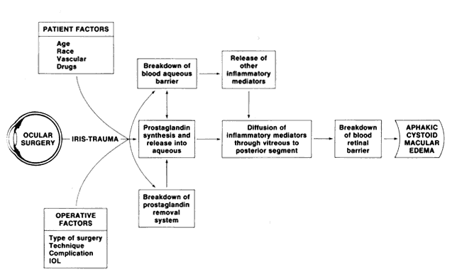 phase.138 It should be noted, however, that prostaglandins, particularly PGE1, are capable of suppressing in vivo inflammatory responses as well.139,140 The conversion of arachidonic acid to prostaglandins is mediated by a cyclooxygenase and peroxidase. Aspirin was reported to inhibit prostaglandin formation in both animal141,142 and human143 in vitro models at this point in the metabolic sequence, as do other aspirin-like compounds, such as indomethacin. Indomethacin, a methylated indole derivative, not only has anti-inflammatory characteristics but is an analgesic and an antipyretic, and at very high concentrations it depresses mucopolysaccharide production.144 The medication has become widely used for rheumatologic conditions, specifically in rheumatoid arthritis145 and ankylosing spondylitis.146 Other nonrheumatologic conditions treated with indomethacin include the prevention of spontaneous labor147 and neonatal cardiac failure secondary to a patent ductus arteriosus.148 EFFECTS ON OCULAR INFLAMMATORY DISEASE The prostaglandin inhibitors, particularly indomethacin, have received much attention because of their potential in decreasing postoperative cystoid macular edema (Fig. 6). In one series,149 systemic indomethacin therapy decreased the incidence of cystoid macular edema after cataract surgery from 15 of 34 eyes (44%) to 5 of 57 eyes (9%) in the 4 to 6 weeks after the procedure. A 1% topical preparation was found to yield similar results.150,151 Miyake and co-workers152 have demonstrated that aqueous concentrations of prostaglandin E and F2 increased after either intracapsular or extracapsular cataract extraction and that pretreatment with indomethacin prevented this rise. In a double-masked study, this agent has been demonstrated to decrease the incidence of pseudophakic cystoid macular edema; however, there was no statistical difference in the final visual acuity between the indomethacin and placebo groups.153 A similar decrease in the development of this problem but with no statistically significant difference in final visual acuity was noted when this agent was used topically in patients undergoing surgery for retinal detachment.154 Jampol155 observed that no clinical trial has yet demonstrated a sustained effect of topical indomethacin in the prevention of cystoid macular edema. Indeed, the incidence of cystoid macular edema between an indomethacin-treated and placebo group was not statistically different 10 weeks151 and 1 to 1<fr1/2> years after cataract surgery. Indomethacin has also been reported to be beneficial in altering the course of acute anterior uveitis when used in conjunction with other corticosteroids.156 Aspirin, by its presumed inhibition of prostaglandin D2 production, a secondary mast cell mediator, dramatically improved the clinical picture of vernal conjunctivitis in patients when used in conjunction with other medications.157 ADVERSE EFFECTS A very high percentage (35% to 50%) of patients experience adverse reactions when receiving this medication, making it often difficult to administer for any extended period of time.144 Gastrointestinal discomfort is the most common complaint, and gastrointestinal bleeding can occur (see Table 2). Ulcerative bowel lesions, diarrhea, occult blood loss, and acute pancreatitis have also been reported. Severe frontal headaches are reported in up to 50% of patients chronically using indomethacin. Corneal opacities and optic disc pallor that were initially reported with this agent are no longer considered to be associated adverse effects.145 Indomethacin may alter the effectiveness of furosemide. Topical preparations of the nonsteroidal anti-inflammatory drugs have fewer side effects. Burning, stinging, and minor irritation may occur with topical preparations. Increased bleeding in ocular tissues has also been reported. |