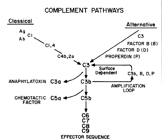| The complement (C) system is a complex network of proteins, enzymes, and inhibitors. The biologic activities of this network are important in both host defense and host reaction to inflammatory conditions (Fig. 1). The tears of normal persons have been shown to contain C3,8,14,15 hemolytic C4,16 hemolytic C,17 C5,18 and factor B.15,17 The complement system is present in the tears of normal persons, which may have an important role in protecting the external eye against infection or participating in the inflammatory action that could lead to ocular damage. |