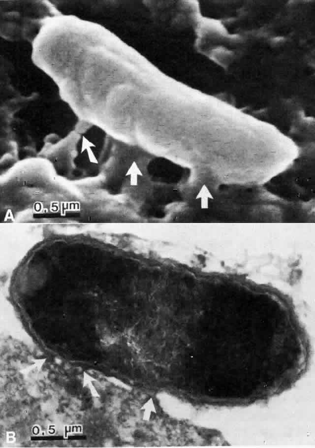 which the bacteria must adhere in order to initiate the infection. The mechanisms behind the development of epithelial defects in the first two groups is self-evident. In the third group, contact lenses may lead to epithelial injury in a number of ways.10 The cornea can be injured during the process of insertion or removal of the lenses, by trauma from defects in the lenses or deposits on the lenses, by lens-induced hypoxia, or by chemical toxicity from contact lens disinfectants. It is not necessary for defects in the epithelium to be full thickness. Corneas with partial-thickness epithelial defects are more susceptible to adherence by Pseudomonas than are corneas with a fully intact epithelium,11 and extended wear of contact lenses modifies superficial epithelial cells so that these cells are more susceptible to attachment by Pseudomonas.12 Overnight wear of currently available soft lenses, which do not have adequate oxygen transmissibility to prevent hypoxia, causes superficial desquamation of epithelium and a greater propensity for adherence by Pseudomonas.13 Most important, however, is corneal swelling induced by overnight wear of contact lenses. The cornea normally swells 2% to 4% during sleep.14 In the presence of a contact lens, however, overnight swelling is increased to an average of 15%, and gross stromal edema can be present on awakening.14–16 In some patients, induced corneal swelling can be sufficient to cause the development of bullae; these can rupture, leading to the development of epithelial defects. In experimental models of contact lens-associated Pseudomonas keratitis in which there was no corneal trauma, the degree of induced corneal swelling under closed-eye conditions was the most important variable associated with the development of corneal infection.17,18 In fact, in the absence of corneal trauma, prolonged lid closure is required for infection to develop.18 This is the most likely mechanism responsible for the proven association between the overnight wear of contact lenses and the increased risk of bacterial keratitis.19,20 For bacteria to infect a mucosal surface, they must adhere to that surface to resist the natural mechanisms that inhibit bacterial colonization. In the eye, these include the protective effects of the cilia, the mechanical washing effect of the tear film and blinking, the coating of the cornea with ocular mucous,21,22 and the presence of antibacterial substances in the tears, including lysozyme, lactoferrin, betalysin, and IgA antibodies. Bacteria do not adhere well to intact corneal epithelium or to stroma completely denuded of epithelium; they readily adhere to injured or diseased epithelium at the edge of an epithelial defect.23 For this reason, a defect in the epithelium that exposes epithelial receptors is a prerequisite for the development of a bacterial corneal infection. It is logical, therefore, to assume that the pathogenicity of a bacterial species for the cornea should be related to its ability to adhere to injured corneal epithelium. The most common causes of bacterial corneal ulceration are P. aeruginosa, S. aureus, and S. pneumoniae.1 Reichert and Stern24 demonstrated that these three organisms exhibit a greater degree of in vitro adherence to human corneal epithelium than do other bacteria that are not common corneal pathogens. Panjwani and colleagues25 reached similar conclusions regarding the adherence of S. aureus and P. aeruginosa to rabbit corneal epithelium. The process of bacterial adherence generally involves a chemical or structural interaction between a component or appendage of the bacterial cell wall, called an adhesin, and a receptor on the epithelial cell or other structure to which the bacteria adhere. For example, teichoic acids, which are essential components of the cell wall of gram-positive cocci, are responsible for adherence of staphylococci and streptococci to epithelial cells.26,27 In the case of gram-negative organisms, filamentous cell wall appendages called fimbriae (commonly called pili, although this term is best reserved for structures involved in the transfer of genetic material) are often the adhesins. Although adherence of Pseudomonas to injured epithelium is known to be the initial step in the pathogenesis of corneal ulceration, the exact nature of the interaction between bacterial and epithelial cells is complex and incompletely understood. It is likely that fimbriae are important Pseudomonas adhesins, especially when adhering to traumatized corneas.28 Cell surface glycoproteins appear to be the major receptors for Pseudomonas fimbriae, especially those containing moieties of mannose,29–33 N-acetylglucosamine,29 galactose β(1,3) N-acetylgalactosamine,29 and most importantly, sialic (N-acetylneuraminic) acid.29,33–35 Adherence is not completely correlated, however, with the presence of fimbriae: Mutant hyperfimbriated strains have diminished adherence and virulence in comparison to normal strains of Pseudomonas.36 It is possible that adherence is also related to other structures expressed by the rpoN gene, which regulates transcription of mRNA responsible for the synthesis of fimbrial proteins.37 Cell membrane lipopolysaccharides are also Pseudomonas adhesins,28,38 and it is likely that their epithelial receptors are neutral glycosphingolipids, especially asialo-GM1.38,39 The physical events involved in the adhesion and early penetration of P. aeruginosa to the rabbit cornea have been studied by Stern and co-workers40 using scanning and transmission electron microscopy. Bacteria inoculated onto the surface of a cornea with an epithelial defect adhere to the injured epithelium within 15 minutes. Adherence is the result of an interaction between the bacterial and epithelial cell walls, with fusion of the two structures (Fig. 1). In some cases, fimbriae or other filamentous bacterial appendages are the adhesive structures. Within the subsequent 15 minutes, excavations in the epithelial cel