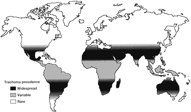During an epidemic, reported attack rates range from 19% to 68.5%. In an outbreak in American Samoa, 48% of the population was affected. The population-based incidence rate during an epidemic in Morocco was 53 cases per 1000 people younger than 20 years. Household attack rates increase according to family size because of crowding and the sharing of beds, and can exceed 70%. Crowding also probably explains different attack rates among various socioeconomic groups. Epidemics do not have a clear-cut seasonal pattern (Fig. 25), although outbreaks in Latin America tend to occur in the hot, rainy season. TRACHOMA Chlamydial eye disease has probably been endemic in Egypt and other ancient civilizations for centuries. Once believed to be the cause of epidemics in the late 18th and early 19th centuries affecting soldiers and sailors,93 viral conjunctivitis and secondary bacterial infection is a more reasonable explanation for “military ophthalmia.”94 Trachoma does not usually spread in an acute fashion. Rather, recognizing an “epidemic” of Chlamydia trachomatis conjunctivitis requires a public health viewpoint. The disease occurs on all continents other than Antarctica and, until the mid-20th century, was prevalent in Europe and North America. Trachoma belts extend around the world (Fig. 26). Besides climate, prevalence is closely linked with socioeconomic development. In endemic areas, there is often familial clustering of active trachoma. In addition to sharing risk factors, genetic susceptibility may predispose to chlamydial infection and to trachomatous scarring.95 The blinding sequelae of corneal scarring and other complications of trachoma develop in a minority of individuals. Rates of hyperendemic trachoma were prospectively assessed during vaccine trials of the 1960s96–106 (Table 25). In the placebo groups, clinical signs of trachoma appeared in 10% to 30% of children during the first year of follow up. Within the next few years, trachoma will develop in about one half of all uninfected children in an endemic area. Neither prophylactic nor therapeutic vaccines have yet proven clinically effective. Childhood trachoma remains prevalent in endemic, underdeveloped regions of the world (Table 26).