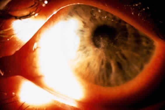 Moore and associates57 described radial keratoneuritis as a presenting sign in Acanthamoeba keratitis. Radial keratoneuritis is characterized by linear, radial, branching infiltrates found in the midstroma, which appear to be located along corneal nerves. These infiltrates begin paracentrally and extend to the limbus in a radial pattern. Conjunctival injection and chemosis are present as a rule. Adenopathy may or may not be present. Acanthamoeba keratitis is characterized by a fluctuating, nongranulomatous inflammatory reaction in the anterior chamber. McClellan and Coster60 cultured Acanthamoeba organisms from an anterior chamber paracentesis in a patient with severe keratitis. Elevated intraocular pressure and cataract, presumably secondary to the anterior segment inflammation, may be seen. Mannis and colleagues59 reported that 39% of cases demonstrated sufficiently pronounced anterior segment inflammation to produce hypopyon. Severe pain, often out of proportion to the degree of anterior segment inflammation, characterizes this disorder, particularly as the keratitis becomes chronic.24,57,59,61 Patients who present with epithelial involvement alone may not complain bitterly of pain.56 A distinguishing feature of Acanthamoeba keratitis is the prominent scleral inflammatory component. Although anterior scleritis may be part of the clinical presentation, the severe ocular pain characteristic of Acanthamoeba keratitis suggests that scleritis may occur commonly in chronic cases of Acanthamoeba keratitis. In some reported cases, the ocular pain became so severe that retrobulbar alcohol injections had to be given.62 A ring-shaped stromal infiltrate is characteristic of advanced infection and is nearly pathognomonic of Acanthamoeba keratitis (Fig. 2).61 The infiltrate is often most dense in its peripheral aspects, forming a characteristic ring. This annular infiltrate may be segmental or circumferential, may be progressive, often involves stromal thinning or furrowing, and may be associated with a variable overlying epithelial defect. The arcuate or ringlike infiltrate is due to polymorphonuclear leukocyte infiltrates generated by chemotaxis after antigen-antibody precipitation,63 analogous to the infiltrate described by Wessely64 after injecting horse serum into the cornea.65