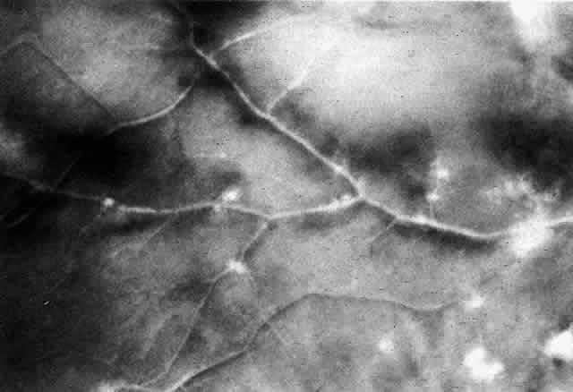 In non-AIDS patients, the spread of disease along vessels has been attributed to infection of vascular endothelial cells, which break free and travel through the retinal circulation.22 In support of this hypothesis, inclusion bodies have been identified in retinal endothelial cells of organ transplant patients with CMV retinopathy. Endothelial cell inclusions have been reported rarely in choroidal tissue of AIDS patients,18,20 but no CMV antigen has been identified in retinal endothelial cells by immunochemical techniques, even in vessels that travel through areas of retinopathy.17 Thus, endothelial cell infection does not appear to play a significant role in the spread of CMV retinopathy in AIDS. CMV retinopathy is more common among patients with AIDS than among other severely immunosuppressed individuals. The frequent development of CMV retinopathy may be related in part to the retinal microvasculopathy that is common to HIV-infected patients.9,23 Ultrastructural studies of retinal capillaries have demonstrated basal lamina thickening, swelling of endothelial cells, narrowing and occlusion of vascular lumina, and loss of pericytes. This microvascular disease may allow access of virus to retinal tissue through damaged vessel walls. Hematogenous spread of virus to the eye is supported by the finding of CMV-like viral particles within macrophages in the choroidal circulation of an AIDS patient with CMV viremia.19 Sludging of blood flow through the retinal circulation may also contribute to infection by increasing the contact time between circulating infected cells and the retina.24 The only systemic risk factor that has been clearly associated with the development of CMV retinopathy in HIV-infected patients is a low CD4 lymphocyte count.12,25,26 The infection almost always occurs in patients with counts less than 50 per cubic millimeter. Human cytomegalovirus is highly species-specific, making the study of human CMV infections in animal models difficult. Attention has therefore been focused on murine CMV infections in mice as a possible model for the study of human CMV retinopathy. Holland and associates showed that murine CMV was capable of causing retinal necrosis in immunosuppressed mice.27 Other investigators have subsequently studied the role of immune defenses against murine CMV retinopathy.28,29 There are many differences between murine and human CMV infections of the eye, however, and extrapolations about disease mechanisms to human CMV retinopathy should be made with caution. For example, murine CMV seems to have a propensity for uveal tissue, unlike its human counterpart. Also, susceptibility of murine and human CMV isolates to various antiviral agents is very different, making these models of little use for the investigation of new antiviral agents. Recently, a rabbit model of disease using human CMV was reported.30 Chorioretinal inflammation and destruction are seen, but additional study will be required to determine the extent to which the lesions and the course of disease mimic human retinal infection. The treatment of CMV retinopathy with new antiviral drugs has been reviewed elsewhere.31 Despite its apparent predilection for retinal tissue, CMV is found occasionally on the ocular surface. Cytomegalovirus has been isolated from conjunctival swabs of patients undergoing bone marrow transplantation at UCLA. Also, 19.5% of childhood leukemia victims in one series had CMV in tears.32 The site of infection was not determined in these studies. CMV was found by culture in ocular adnexal tissue of a patient with AIDS and conjunctivitis, but autopsy examination revealed no virus in the lacrimal gland.33 Cytomegalovirus has also been found by electron microscopy in the conjunctiva of an HIV-infected patient without clinical signs of disease related to CMV.34 VARICELLA ZOSTER VIRUS Zoster ophthalmicus, with cutaneous lesions in the dermatome of the first division of the trigeminal nerve, keratitis, and anterior uveitis, can be seen relatively early in the course of a patient's HIV disease and is believed to be a harbinger of further deterioration in the patient's immune status.35,36 The severity of lesions and inflammation varies widely between patients. Patients with HIV disease can also develop a chronic, productive varicella zoster virus infection of the corneal epithelium that resembles herpes simplex virus epithelial keratitis.37 This infection has never been reported in immunocompetent patients. It occasionally follows zoster ophthalmicus, with isolation of varicella zoster virus from corneal lesions many weeks after the resolution of cutaneous vesicles. In other patients there is no history of cutaneous zoster. Varicella zoster virus can also cause a severe necrotizing retinopathy in HIV-infected patients (Fig. 4).38–41 It may present as an isolated infection or may occur concurrently with or after cutaneous zoster in any dermatomal distribution. In most HIV-infected patients, varicella zoster virus retinopathy presents as a distinctive clinical disorder known as “the progressive outer retinal necrosis syndrome.”41 It is characterized by multifocal, deep opaque retinal lesions (believed to be retinal edema) that quickly coalesce to involve the entire retina. The retina can become completely necrotic over a period of a few days to a couple of weeks. There is little or no vitreous or anterior chamber inflammatory reaction. Occlusive vasculitis is not a primary feature of the disease, although patients are ultimately left with severe vascular attenuation. The optic nerve may be hyperemic, and optic atrophy is a sequela of the infection. Histopathologic examination of two cases showed viral antigens and viral particles in the outer retinal layers, consistent with the appearance of deep retinal lesions.39 There were variable amounts of inflammation in the retinas, and scattered areas of choroidal inflammation, although there was no evidence of choroidal infection by the virus.
