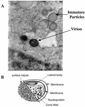 From progeny DNA templates, late transcription factors are expressed from intermediate genes, and late gene RNA is synthesized. Late genes encode the early transcription system, enzymes, and structural proteins necessary for virion assembly. By 4 hours postinfection, virion morphogenesis commences with the formation of membrane structures in the intermediate compartment and the packaging of resolved unit-length genomic DNA. The intracellular mature virus (IMV) has one membrane derived from the intermediate compartment. Some IMVs acquire an additional double layer of intracellular membrane derived from the trans Golgi network that contains unique virus proteins, the intracellular enveloped virus (IEV). IEVs are transported to the periphery of the cell where fusion with the plasma membrane ultimately results in release of extracellular enveloped virus (EEV) or, if attached to the exterior surface of the plasma membrane, as cell-associated enveloped virus (CEV). While IMV and CEV/EEV are infectious, the external antigens on the two virion forms are different. Thus, each virion type probably binds to different cellular receptors and are likely uncoated by different mechanisms. EEVs are thought to be the most important form involved in cell-to-cell spread and systemic disease. |