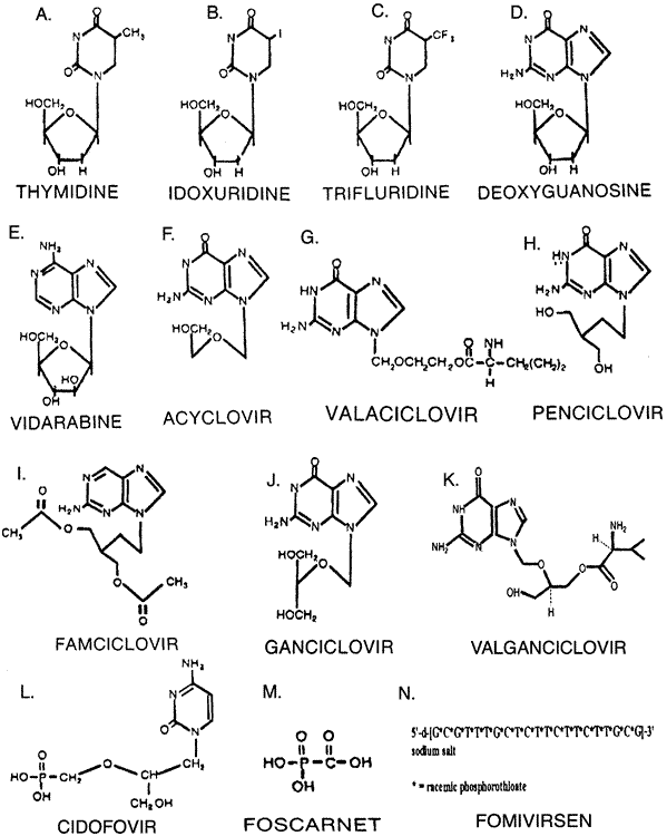 | Although it is difficult to target viral components without hitting a few cellular components on the way, important advances have been made in antiviral chemotherapy. Nine systemic or intracameral antiviral drugs (vidarabine, acyclovir, famciclovir, valaciclovir, ganciclovir, valganciclovir, cidofovir, foscarnet, and fomivirsen) and four topical agents (idoxuridine, vidarabine, trifluridine, and acyclovir) are in widespread use in ophthalmic viral infections. Topical and oral BVDU and interferon show clinical potential but remain largely experimental.1–8 The organisms targeted most effectively by these drugs are herpes simplex virus (HSV), herpes varicella-zoster virus (VZV), cytomegalovirus (CMV), vaccinia, and to some extent, adenovirus and Epstein-Barr virus (EBV). |