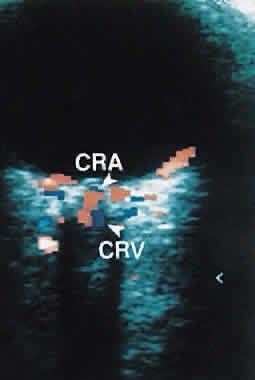 and suitable for orbital CDI. Scans are made through the eye and orbit in multiple planes to identify the desired structures and vessels. After the desired vessel is located and the angle of incidence selected, a few seconds of Doppler waveform are recorded. Several measurements are recorded for each vessel. The peak and trough of the frequency waveform are selected by the operator by visual inspection, and the instrument then calculates the flow velocities from these frequency shifts. The system analyzes a sample of pulsed Doppler signal from within a small sample volume (0.2 × 0.2 mm) to calculate blood flow velocities, correcting for the angle of incidence in the calculation. In each vessel examined, the peak systolic and end diastolic velocities can be determined, as well as the average velocity. Another parameter calculated from CDI is pulsatility index, which is a measure of impedance or total resistance to flow from all factors. Arterial wall musculature is thought to account for most of the impedance. A number of different pulsatility indices have been developed. One commonly used with CDI is Gosling's pulsatility index, which is calculated using the equation: pulsatility index = (peak systolic velocity - end diastolic velocity)/average velocity Another is Resistive index or Pourcelot's ratio, which is calculated as follows: resistive index = (peak systolic velocity - end diastolic velocity)/peak systolic velocity These ratios are reported from 0 to 1 or from 0% to 100%, with 0 denoting no resistance and 1 or 100% meaning maximum resistance. In addition to graphically displaying the frequency waveforms, CDI also displays a gray-scale 2D ultrasound image of the tissues and vessels. Normal orbital structures are well delineated ultrasonically with this equipment, including the globe, optic nerve, extraocular muscles, and orbital blood vessels. Intraocular structures also may be appreciated with this technique, including anterior chamber, lens, and vitreous cavity. Superimposed on this 2D display is the color-encoded Doppler shift. The color display allows for detection of blood flow below the resolution of the gray-scale image in the vessels. The color display and waveform distinguish and separately evaluate adjacent vessels, such as the central retinal artery and central retinal vein, which lie in close proximity within the optic nerve (Fig. 2). Colors may be arbitrarily assigned, but often red is used to designate flow toward the transducer and blue to designate flow away from the transducer. When the orbital vessels are examined through the closed lids, the ultrasound beam is nearly parallel to the vessels, and thus arterial flow is red and venous flow is blue. Arteries and veins also are differentiated ultrasonically by the pulsatile nature of flow in arteries in contrast to the more-continuous, less-dynamic flow in veins.