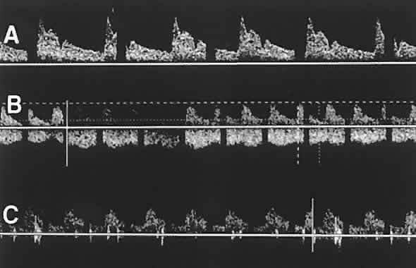 the source and decreases as the observer moves away from the source. In 1845, Buys Ballot verified Doppler's theory by borrowing a locomotive and having a trumpet player stand on the moving train, while an observer who had perfect pitch stood at the station. It was found that indeed the trumpet's pitch was half a note higher on approach to the stationary listener in comparison with when the trumpet player was stationary and half a note lower when moving away from the stationary observer.3 Doppler's equation is as follows: V = (Df × c)/(2Fo × cos A) where V = velocity (blood flow velocity in this application), Df = Doppler frequency shift or incidence frequency minus reflected frequency. In CDI, it is frequency of ultrasound emitted by transducer minus frequency returning to transducer after reflection off moving erythrocytes, c = speed of sound in tissue, Fo = frequency of the source (frequency of the ultrasound waves emitted from the transducer), and A = angle of incidence of ultrasound beam to the direction of blood flow. Maximum Doppler shift occurs when A = 0 degrees. This angle (A) is a source of significant error in measuring blood flow velocity if the angle used in measurement is greater than 45 degrees. Furthermore, as the angle (A) approaches 90 degrees, it becomes difficult to differentiate forward from reverse flow, and both may be detected and averaged. A also must be controlled to create reproducible results. |