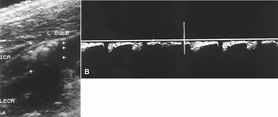 A case report by Knapp and coworkers18 describes a patient with amaurosis fugax occurring only when the eye was abducted. Computed tomography revealed an intraconal mass, and CDI was used to confirm that the mass was the cause of the amaurosis by demonstrating a reduction of blood flow in the central retinal artery when the eye was abducted. This allowed the surgeon to feel confident that the mass was the cause of the visual obscurations and that the eye's vascular supply was likely not compromised in some other way. CAROTID OCCLUSIVE DISEASE AND OCULAR ISCHEMIC SYNDROME Hemodynamically significant carotid artery stenosis can lead to the ocular ischemic syndrome, amaurosis fugax, or central retinal artery occlusion. Mawn and coworkers19 examined a group of 24 patients with greater than 75% carotid artery stenosis and found reduced mean central retinal artery and posterior ciliary artery systolic velocities as compared with normal patients. Half of these 24 patients had reversal of flow in the ophthalmic artery. Twelve patients underwent carotid endarterectomy, and their mean systolic flow velocities improved after surgery in the central retinal artery, posterior ciliary arteries, and ophthalmic artery. The patients with ocular ischemic syndrome had CDI parameters no different from patients with severe carotid artery stenosis without signs of ocular ischemic syndrome. These findings were consistent with those of Ho and associates20 regarding patients with ocular ischemic syndrome. Hu and associates21 went a step further and stated that there is a statistically significant difference in mean peak systolic and end diastolic velocities in the central retinal artery and ophthalmic artery among patients with varying degrees of carotid artery stenosis. These values, however, were not compared with those of normal patients. Ho and coworkers20 describe the use of CDI in the ocular ischemic syndrome. This series examines 16 eyes with ocular ischemic syndrome and shows reduced peak systolic velocities as well as increased vascular resistance in the central retinal artery and posterior ciliary arteries. Twelve of 16 eyes had reversal of ophthalmic artery blood flow (Fig. 6). This finding was thought to be quite specific for ocular ischemic syndrome by the authors, who had seen this phenomenon in multiple cases of ocular ischemic syndrome with associated internal carotid artery stenosis and only in one case of giant cell arteritis and once in an ophthalmic artery occlusion as a late development. It also was observed that the eyes in the study population with the worst visual acuity had no detectable posterior ciliary artery blood flow. GIANT CELL ARTERITIS Ho and coworkers22 present a consecutive series of 22 patients with biopsy-proven giant cell arteritis and appropriately matched control subjects. The patients with giant cell arteritis had reduced mean flow velocities in the central retinal artery and posterior ciliary arteries. Other findings included ophthalmic artery aliasing (turbulent high-velocity flow at focal areas of vessel stenosis) and, in one case, reversal of flow in the ophthalmic artery. Nine affected eyes demonstrated no detectable flow in the short posterior ciliary arteries. Williamson and colleagues23 also render a case of giant cell arteritis in which the patient had anterior ischemic optic neuropathy. CDI demonstrated no flow in the posterior ciliary arteries and later, as the condition clinically worsened, no flow in the ophthalmic artery. CAROTID-CAVERNOUS FISTULA Another condition in which CDI has helped significantly in both diagnosis and monitoring is carotid-cavernous fistula. In this condition, there is a communication between the cavernous sinus and either the internal carotid artery or dural branches of the internal or external carotid artery. This can lead to arterialization of the orbital and conjunctival veins because of elevated pressure in the area of the cavernous sinus. CDI in this condition frequently shows a dilated superior ophthalmic vein with a pulsatile, arterialized pattern of blood flow (Fig. 7). The flow velocity in the superior ophthalmic vein is increased, while the flow velocity in the ophthalmic artery may be decreased. The 2D ultrasound portion of this examination may highlight other features found in carotid-cavernous fistulas, such as enlargement of engorged extraocular muscles.