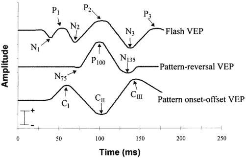 response. The VEP waveform morphology also highly depends on the type of stimulus presentation. Three predominant types of visual stimuli are used to elicit VEPs: diffuse flash, pattern reversal, and pattern onset-off. The responses obtained with each type of stimulus have a distinct characteristic waveform (Fig. 3). THE FLASH VISUAL EVOKED POTENTIAL The earliest VEP studies used photic flashes produced by photostimulators to generate spatially unstructured or diffuse flash stimuli.10,11 Original descriptions of the waveform of the VEP obtained with flash stimuli disagreed concerning many of the waveform characteristics of the response. These discrepancies were probably the result of various factors, including differences in the electrode positions, the flash intensities, and the temporal frequencies of the stimuli used in different laboratories. However, there is now reasonably good agreement that the flash VEP waveform consists of a complex series of waves with positive and negative peaks that are designated in numerical order (Fig. 3). The most prominent and reproducible of these peaks are the second negative peak (N2), with a normal latency of approximately 70 to 90 milliseconds, and the second positive peak (P2), with a normal latency of approximately 100 to 120 milliseconds. It is also now well established that the amplitude of the VEP to diffuse flashes varies with the temporal frequency of stimulus presentation. The largest amplitude is obtained with flashes that are presented at approximately10 Hz. In the clinic, the flash VEP is most often usedwhen a pattern VEP cannot be obtained. Patients with poor visual acuity, media (cornea, lens, vitreous) opacities, poor fixation (including infants), and uncorrected refractive error may have a measurable flash VEP that can be helpful in the assessment. The amplitude of the flash VEP depends on the luminance of the flash stimulus. For the flash VEP, a luminance of 1.5 to 3.0 candelas/m2 is generally recommended. A decrease in the brightness of the stimulus reaching the retina, produced by miosis (accommodative or pharmacologic), neutral density filters, or, rarely, dense cataracts results in latency delays (i.e., increased latency). This is also true for pattern VEPs. A special variant of the flash VEP is the multifocal VEP.12,13 The stimulus for the multifocal VEP is a changing pattern of discrete flashes, usually made of 61 to 241 hexagons covering up to ±25° of the visual field rather than the single full-field flash used in conventional flash VEP. The flash position changes in a pseudorandom fashion according to so-called m-sequences that guarantee that no stimulus sequence is repeated during an examination and that all stimulus sequences appear only once. This is necessary for the multiplexed signal to be separated into signals for every test location. As a result, the multifocal VEP produces a spatially discrete pattern of responses and an underlying mathematical system that derives the true signal from each location, rather than a single stimulus and a single response. THE PATTERN VISUAL EVOKED POTENTIAL The development of techniques that use patterned stimuli to elicit bioelectrical signals from the visual cortex was a methodologic advancement that greatly increased the clinical usefulness of the VEP. This approach takes advantage of the functional organization of the proximal retina and visual cortex, which is preferentially sensitive to spatially patterned stimuli. Two types of patterned stimuli, contrast-reversing or onset-offset patterns, are generally used to record VEPs. Pattern-reversal VEPs are recorded using a uniform repetitive checkerboard or bar grating pattern in which the pattern elements are contrast-reversed in a fixed sequenced. The overall luminance of the display and the contrast between the pattern elements remain constant throughout the entire recording. The waveform of the pattern-reversal VEP (Fig. 3) normally consists of three principal features: an initial negativity with a latency of approximately 70 to 80 msec (N75), a larger positive component with a latency of approximately 90 to 110 msec (P100), and a large negative component with a latency of approximately 130 to 140 msec (N135). In visually normal adults, the maximal pattern-reversal VEP is evoked with a check size between 10 and 20 minutes.14,15 Smaller or larger checks evoke smaller amplitude pattern VEPs. Larger checks may elicit responses that confound pattern and luminance contributions.15 For the pattern onset-offset VEP, the elements in the pattern are abruptly alternated with a spatially unstructured field of identical space-averaged luminance so that when the pattern appears or disappears there is no change in mean luminance. Generally, the pattern is off (diffuse background) for longer than it is on. Typically, the pattern onset-offset VEP has three prominent components designated C1, C2, and C3 (Fig. 3). C1 is the initial positive component and has a latency of approximately 70 to 80 milliseconds. C2 is a large negative component and has a latency of approximately 100 to 120 milliseconds. C3 is the second major positive component and has a latency of approximately 140 to 150 milliseconds. The pattern onset-offset approach can be useful in distinguishing the pattern and luminance contributions in the pattern VEP.16 The VEP obtained with pattern stimulation, either pattern reversal or pattern onset-offset, is dominated by contributions from the macula.5,17 This is not surprising because the central few degrees of vision have a large representation in the striate area and are located posteriorly in the occipital lobe, closer to the surface electrodes. Checks smaller than 20 minutes evoke a large pattern VEP when the field is limited to the macula field.18 The peripheral retinal contribution to the pattern VEP is the result of pattern and luminance changes rather than a true pattern response.7,18 Large check stimulation of the retina periph