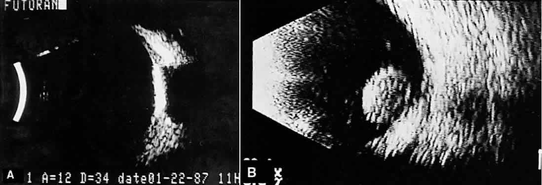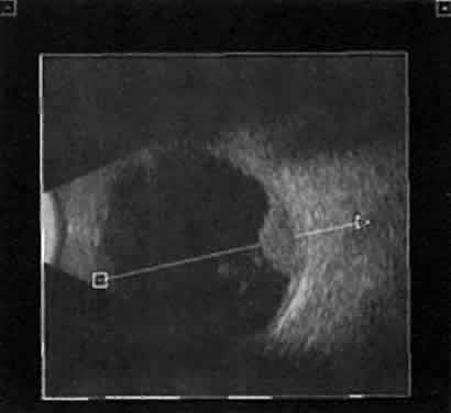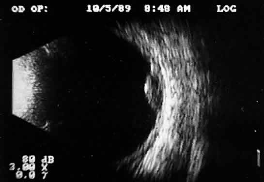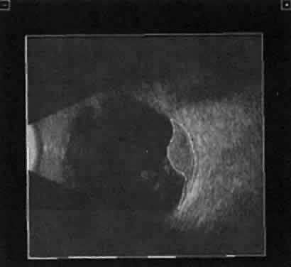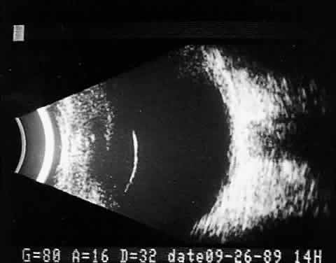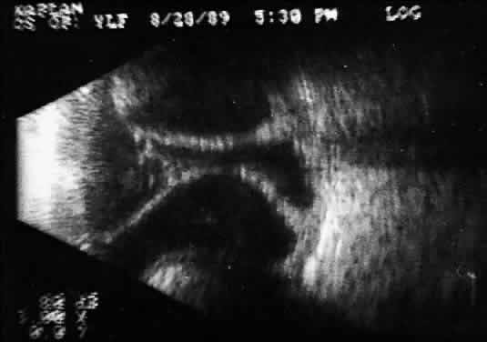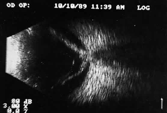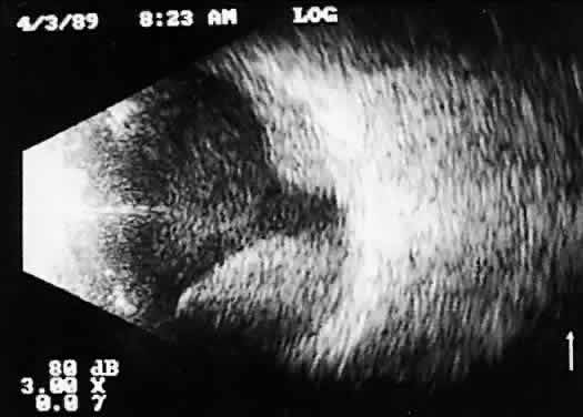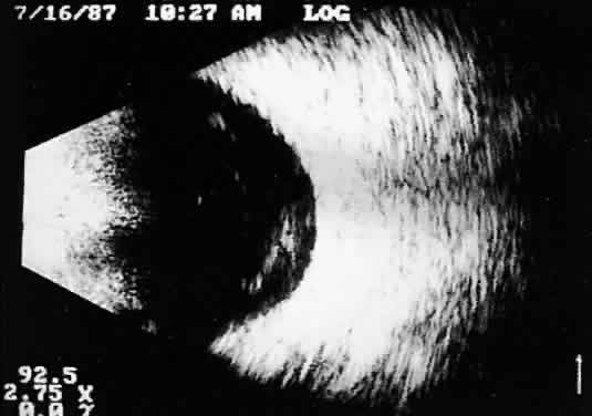 When combined with radiographic information and metal localization technique, ultrasonically derived information aids enormously in the clinical evaluation of the patient with an intraocular foreign object. However, ultrasound alone is not sufficient to rule out a foreign object. PHTHISIS Once the globe has become small and shrunken, ultrasound evaluation becomes nearly impossible. Often, calcifications of a variety of ocular tissues make signal transfer difficult. General landmarks become obscure, and interpretation is unreliable. Small tumor identification in such situations is usually beyond the scope of reason. ORBITAL ULTRASONOGRAPHY Orbital ultrasonography is far more complex than ocular evaluation for a number of reasons. The shape and depth of the orbit make access for diagnostic ultrasound techniques more difficult. Ocular examinations are usually performed with 10-megacycle probes or higher frequencies. Lower ultrasound frequencies (5 to 8 megacycles) are often used to penetrate to orbital tissue depths. Lower-frequency probes have less resolution capability. Further, recognition of abnormalities within orbital tissues is more difficult because orbital tissues are highly reflective, making the appearance of subtle gray-scale changes in B-scan or amplitude changes in A-scan more difficult to appreciate against highly reflective tissues. Nevertheless, a vast quantity of literature is available concerning orbital technique and tissue characterization.8,9,14,15 In general, orbital ultrasonography is most useful in the evaluation of patients with exophthalmos related to a number of diseases, including primary and secondary tumors of the orbit, inflammatory diseases, and changes secondary to thyroid disease. The displacement of orbital fat by more homogeneous tumor tissue is appreciated more readily in B-scan imaging. Tissue differentiation is better appreciated with simultaneous A-scan or standardized A-scan techniques. Two caveats are important: orbital interpretation is not for the novice, and examination of the deeper portions of the orbit, including the orbital apex, is usually best performed by other techniques, such as computed tomography or magnetic resonance imaging. Inflammatory conditions such as pseudotumor can involve a variety of orbital tissues, causing infiltration and thickening of the extraocular muscles, as well as space-occupying lesions within the orbital fat. Frequently, inflammatory exudate accumulates in the potential space between Tenon's capsule and the sclera. Such accumulations are easily detected during ultrasonography as dark, relatively echo-free spaces just outside the strong scleral echo. Thyroid orbitopathy and exophthalmos are also frequently associated with thickening of the extraocular muscles, as well as other changes of the orbital contents. POSTERIOR VITREORETINAL INTERFACE EVALUATION Recent improvements in image quality and fused, real-time display have made ultrasound image interpretation easier for every ultrasonographer. Visualization of subtle changes such as movement and recognition of the posterior formed vitreous hyaloid are now possible, even in clear media situations. These clear vitreous structures, which are often exceedingly difficult to appreciate optically, can be recognized ultrasonically after a relatively short period of training (Fig. 17). Clinically, establishing the position of the posterior hyaloid is important in evaluating a variety of vitreous retinal disorders, such as macular holes, tractional detachments, and partial or complete vitreous separations.16,17