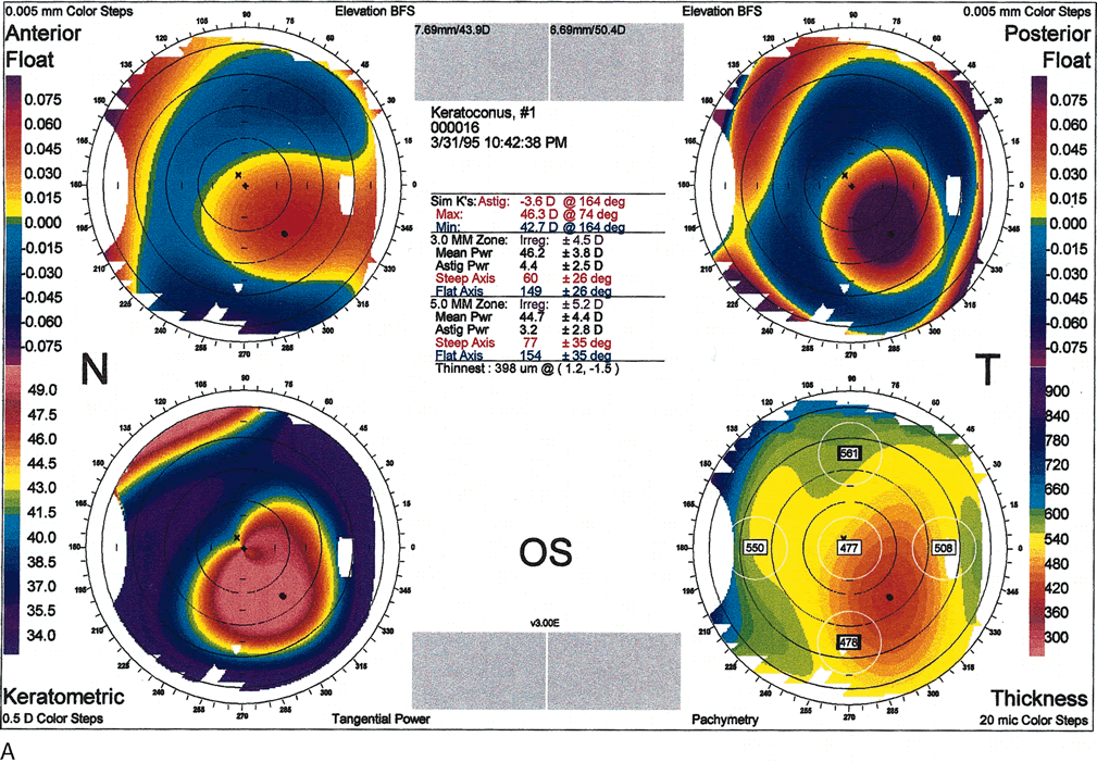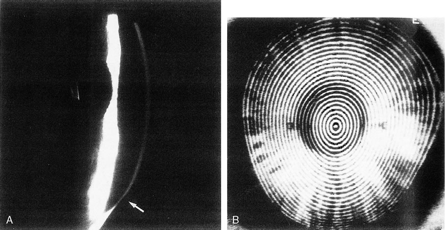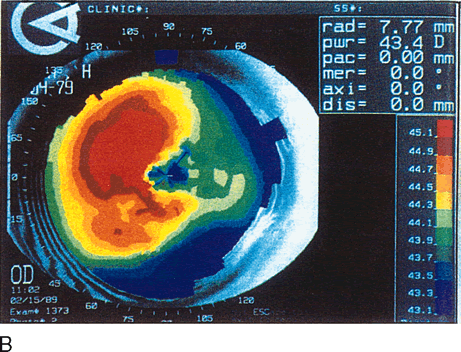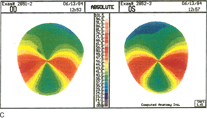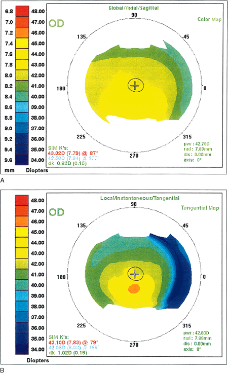 SURFACE MASSES AND PTERYGIA Irregularities of the corneal surface can result from compression by external agents, abnormalities of the corneal epithelium, or stromal alterations. Compression of the cornea can occur from eyelid lesions such as chalazia, lid hemangiomas, and dermoids. Compressive lesions have direct as well as indirect effects on corneal topography. There is a flattening of the corneal curvature directly underneath the eyelid lesion and there is a secondary indirect steepening of the corneal curvature adjacent to the area of flattening. Scleral masses will cause scleral flattening immediately beneath the mass and adjacent corneal steepening. Tear film disturbances and epithelial diseases that affect the tear film canl result in topographic irregularities. The keratometer and Placido disk systems are reflective instruments that rely on an intact air–tear film interface. In such conditions, utilizing a projection-based system to evaluate corneal topography may prove more accurate. Focal patches of dryness such as in keratoconjunctivitis sicca appear as local areas of flattening. More important, however, corneal topography can often detect subtle changes in epithelial regularity, significant enough to cause patient complaints but not visible by slit-lamp biomicroscopy. This has been seen in recurrent erosion syndrome and in anterior basement membrane dystrophy (Fig. 8). A local depression such as an ulcer or dellen may produce focal flattening. Local elevations, such as Salzmann's nodules or Thygeson's keratitis, produce a focal steepening.1 Pterygia affect the corneal epithelium as well as the underlying stroma. Visual disturbances can result from tear-film irregularity or from growth onto the cornea, resulting in astigmatism. Both regular and irregular astigmatism can be induced. There is progressive flattening as the corneal periphery is approached. As the size of pterygium increases, the amount of astigmatism and associated topographic abnormalities increase.13–15 O'Brart and associates determined that the mean keratometric astigmatism induced is about 4 D with-the-rule but the mean refractive astigmatism is about 2 D.16 This does not affect refraction significantly until the pterygium head encroaches on the visual axis (Fig. 9). There are two hypotheses regarding the mechanism of induced astigmatism. One theory proposed by Hochbaum and associates suggests that horizontal steepening is induced in the semi-meridian aligned with the pterygium due to traction from subepithelial fibrosis.17 The second theory proposes that the mechanism is due to the tear film; the tear meniscus in front of the head of the pterygium pools in the angle between the pterygium and the paracentral cornea, leading to the observation of topographic flattening. Pterygium removal results in decreased astigmatism because of steepening of the flat meridian and flattening of the steep perpendicular meridian. In eyes with large pterygia that encroach within 2 mm of the line of sight, astigmatism may not resolve completely. Interestingly, studies have shown that postoperatively, there is an overall increase in mean central corneal power and a reduction of corneal asphericity, suggesting that the ratio of the astigmatic change in the treated meridian to that 90 degrees away was not one-to-one. The amount of surgically induced change in astigmatism increases with the size of the pterygium.18,19 Refractive changes stabilize 1 month postoperatively; therefore, Tomidokoro et colleagues recommend that cataract or other refractive surgery be postponed until this time.13,14 STROMAL ECTASIAS Crneal ectasias are non-inflammatory diseases that are characterized by thinning and protrusion of the corneal stroma resulting in shape changes. This family of diseases consists of keratoconus, keratoglobus, and pellucid marginal degeneration. Normally, the stromal collagen lamellae run circumferentially in the corneal periphery, producing a round shape. However, progressive thinning of the stroma leads to flattening of the corneal curvature along that meridian. This induces the peripheral ring of collagen lamellae to assume a more oval shape and transmits a compressive force to the lamellae that are 90 degrees away, resulting in corneal steepening in that meridian. This mechanism is known as biomechanical coupling. Furthermore, intraocular pressure at the site of weakness causes protrusion of the cornea. Keratoconus Keratoconus is a bilateral but typically asymmetric ectasia that has onset in the late teens and usually progresses slowly over many years. Patients have a history of progressive myopia, oblique astigmatism, and reduction of spectacle-corrected visual acuity. Prior to the introduction of methods to assess corneal topography, the diagnosis was based on history and the presence of clinical signs. In mild disease, however, these clinical signs are subtle or altogether absent. The advent of refractive surgery has made the detection of subclinical keratoconus of increasing importance in order to prevent the surgical treatment of these eyes. Keratoconus has an incidence of 1 in 2000 inf the general population but is being detected in 5% of myopes who present for refractive surgery evaluation.20 Keratoconus can be categorized according to the severity of power (mild, moderate, severe); location of cone (superior, central, inferior); and shape of cone (oval, globus, nipple) (Fig. 10). Corneal thinning most commonly occurs in the inferocentral cornea, and protrusion also occurs in this region. The point of maximal protrusion is referred to as the apex of the cone. The steepest corneal slope lies just peripheral to the apex (usually inferior in central cones). The region of smallest radius of curvature (therefore the greatest corneal power) lies between the cone's apex and its steepest slope. The mechanism of biomechanical coupling causes the flattest meridian to be approximately horizontal and the steepest meridian to l