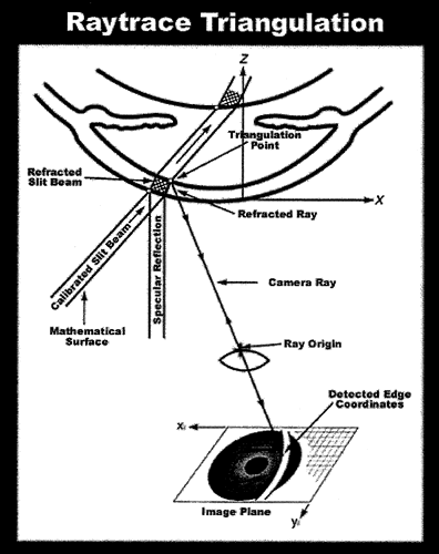disk, scanning slit topography, and wavefront sensors. The keratometer and Placido disk are reflection-based methods. An object is projected onto a central corneal zone of known diameter and distance from the light source. The cornea acts like a convex mirror, reflecting light, and a virtual upright image is produced. The ratio of the image and object diameters is used to estimate the radius of curvature along a particular meridian (Fig. 1). With the keratometer, only four data points are generated. Two lie on the steepest axis, and the other two are on an axis 90 degrees away. The keratometer (Von Helmholtz, Javal-Schiotz) reflects the four points over a central zone of 2.88 to 4 mm (depending on the diopteric power of the cornea). The instrument is highly accurate for regular spherocylindrical surfaces such as the central zone of a normal cornea, butit has limited value in irregular corneas. Furthermore, no information is available for zones inside, outside, or between the four reference points. In addition, the keratometer has less accuracy for corneal powers below 36 diopters (D) and above 50 D, although it has a theoretical range of 30 to 60 D. The Placido disk reflects a series of concentric rings, or mires, off the cornea. Each mire produces an upright virtual image in the anterior chamber of the subject's eye. The distance between each mire to the corneal apex is compared to the image's distance to the corneal apex; the ratio of image distance to mire distance determines the anterior corneal curvature along any particular meridian. Placido devices include photokeratoscopes (Corneoscope) and computerized videokeratoscopes (TMS, EyeSys). Placido disk systems have certain advantages over the keratometer. The photokeratoscope can measure 12 mires over 70% of the corneal surface and over an infinite diopteric range. The computerized videokeratoscope assumes that the corneal surface is spherical and of uniform refractive index; it can measure 15 to 38 mires over 95% of the corneal surface and has a theoretical range of 8 to 110 D1 (Fig. 2). Videokeratoscopes display topographical information using different maps. A picture of the cornea is provided as a raw image. This allows the clinician to recognize distortions of the tear film and loss of fixation that may compromise the accuracy of the videokeratoscopy. The data is then presented as a color map with either an absolute or a normalized scale. On color maps, the warmer colors (red, orange, and yellow) represent the steeper areas; the cooler colors (blue and green) represent the flatter regions. The absolute scale is a fixed system in which each color is consistently assigned to a particular curvature or power. This facilitates the comparison of topographies between patients and over time in the same patient. Each videokeratoscope has its own absolute color map with fixed diopteric intervals covering the range of corneal powers. The normalized (relative) scale maximizes the utilization of all possible colors to evaluate a specific cornea. The color map with a normalized scale has narrower intervals between the assigned colors. Although the normalized scale allows the clinician to evaluate a particular topography with greater detail, it makes comparison between examinations difficult because the scale may have changed in range and diopteric interval. Another option available to the clinician is the adjustable scale, which allows the clinician to customize the step interval and diopteric range of the contours. Placido devices use axial (sagittal, global, average, or standard), tangential (instantaneous, true, or local), or refractive power maps to calculate radius of curvature (Fig. 3). The axial map measures the perpendicular distance from the tangent at a point to the optical axis and therefore has a spherical bias. This gives a global description of shape and may be less accurate in the corneal periphery and with irregular surfaces. On the other hand, a tangential map displays the radius of curvature of a point with respect to its neighboring points along a specific meridian. It has a less spherical bias than an axial map and therefore may be preferred to assess the corneal periphery or in irregular corneas. The refractive map uses Snell's law to measure the focal power of the cornea. The computer program gives the clinician three options for delineating the major and minor axes for a given cornea. The orthogonal axes mark the major and minor axes as measured at the central 3-mm zone. The zonal axes mark the major and minor axes at the 3-mm as well as the 5-mm and 7-mm zones. This allows the clinician to quickly assess if there is a shift in the major and minor axes with progression toward-s the corneal periphery. The instantaneous axes option draws a continuous line from the center of the cornea to the periphery, showing the true major and minor axes at any given diameter (Fig. 4). Data can also be manipulated by videokeratoscope computer programs to glean desired information. Cross-sectional maps display the elevation and depression of the anterior corneal surface along any given meridian. Difference maps can compare pre- and post-treatment corneal topographies by subtracting the first map from the second. Statistical indices, which are often used in clinical studies, can also be obtained using computer programs. Scanning slit topography (e.g., Orbscan) is a projection-based method that uses a series of slit-beam images to generate data regarding anterior surface curvature, posterior surface curvature, and pachymetry. Therefore, the cornea is represented as a three-dimensional (3D) structure. A slit lamp projects a beam at 45 degrees onto the cornea. Twenty slits are projected sequentially on the eye from the left side, and 20 slits from the right, for a total of 40 slits that produce 240 data points per slit. This produces an image that is a height map of the cornea relative to a best-fit sphere. The elevations and depressions are