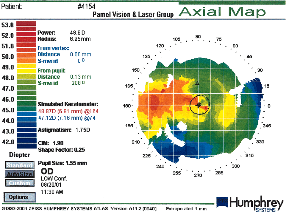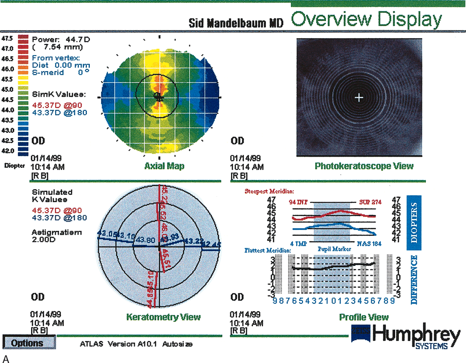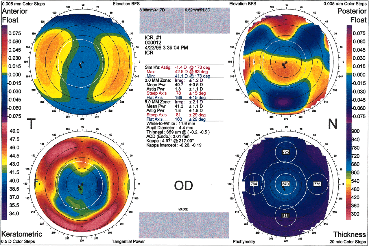 1. Corbett MC, Rosen ES, O'Brart DPS: Corneal Topography: Principles and Applications. London, BMJ Books, 1999. 2. Orbscan Operator's Manual for the Slit Scan Corneal Tomography/Pachymetry System: Software Version 2.10. ORBTEK, Inc., Utah. 3. Gills JP: Corneal Topography: The State of the Art. Slack, Thorofare, NJ, 1995. 4. Naseri A, McLeod SD, Lietman T: Evaluating the human optical system: Corneal topography and wavefront analysis. Ophthalmol Clin North Am 14:269–273, 2001. 5. Haman H: A quick method for analyzing Hartmann-Shack patterns: Application to refractive surgery. J Refract Surg 16: S636–S642, 2000. 6. Mrochen M, Kaemmerer M, Seiler T: Wavefront-guided laser in in-situ keratomileusis: Early results in three eyes. J Refract Surg 16:116–120, 2000. 7. Wilson S, Ambrosio R: Computerized corneal topography and its importance to wavefront technology. Cornea 20:441–454, 2001. 8. Pallikaris IG, Panagopoulou SI, Molebny VV: Clinical experience with the Tracey technology wavefront device. J Refract Surg 16:S588–S591, 2000. 9. Hong X, Thibos LN: Longitudinal evaluation of optical aberrations following laser in in-situ keratomileusis surgery. J Refract Surg 16:S647–S650, 2000. 10. Bogan SJ, Waring GO, Ibrahim O, et al: Classification of normal corneal topography based on computer-assisted videokeratography. Arch Ophthalmol 108:945–949, 1990. 11. Marin-Amat M: The physiological variations of the corneal curvature during life: Their significance in ocular refraction. Bull Soc Belge Ophtalmol 136:263, 1957. 12. Liu Z, Huang A, Pflugfelder SC: Evaluation of corneal thickness and topography in normal eyes using the Orbscan corneal topography system. Br J Ophthalmol 83:774–778, 1999. 13. Tomidokoro A, Oshika T, Amano S, et al: Quantitative analysis of regular and irregular astigmatism induced by pterygium. Cornea 18:412–415, 1999. 14. Tomidokoro A, Miyata K, Sakaguchi Y, et al: Effects of pterygium on corneal spherical power and astigmatism. Ophthalmology 107:1568–1571, 2000. 15. Avisar R, Loya N, Yassur Y, et al: Pterygium-induced corneal astigmatism. Isr Medl Assoc Jl: Imag 2:14–15, 2000. 16. O'Brart DPS, Corbett MC, Rosen ES: The topography of corneal disease. Eur J Implant Refract Surg 7:173–183, 1995. 17. Hochbaum DR, Moskowitz SE, Wirtschafter JD: A quantitative analysis of astigmatism induced by pterygium. J Biomech 10:735–746, 1977. 18. Cinal A, Yasar T, Demirok A, et al: The effect of pterygium surgery on corneal topography. Ophthalmic Surg Lasers. 32:35–40, 2001. 19. Budak K, Khater TT, Friedman NJ, et al: Corneal topographic changes induced by excicision of perilimbal lesions. Ophthalmic Surg Lasers 30:458–464, 1999. 20. Auffarth GU, Wang L, Völcker HE: Keratoconus evaluation using the Orbscan Topography System. J Cataract Refract Surg 26:222–228, 2000. 21. Chastang PJ, Borderie VM, Carvajal-Gonzalez S, et al: Automated keratoconus detection using the EyeSys videokeratoscope. J Cataract Refract Surg 26:675–683, 2000. 22. Rabinowitz YS, Rasheed K: KISA % index: A quantitative videokeratography algorithm embodying minimal topographic criteria for diagnosing keratoconus. J Cataract Refract Surg 25:1327–1335, 1999. 23. Maeda N, Klyce SD, Smokek MK: Comparison of methods for detecting keratoconus using videokeratology. Arch Ophthalmol 113:870–874, 1995. 24. Rao SK, Fogla R, Padmanabhan P, et al: Corneal topography in atypical pellucid marginal degeneration. Cornea 18:265–272, 1999. 25. Karabatasa CH, Cook SD: Topographic analysis in pellucid marginal degeneration and keratoglobus. Eye 10:451–455, 1996. 26. Wilson S, Lin D, Klyce S, et al: Terrien's marginal degeneration: Corneal topography. Refract Corneal Surg 6:15–20, 1990. 27. Zegans ME, Srinivasan M, McHugh T, et al: Mooren ulcer in South India: Serology and clinical risk factors. Am J Ophthalmol 128:205–210, 1999. 28. Zegans ME, Srinivasan M: Mooren's ulcer. Int Ophthalmol Clin 38:81–88, 1998. 29. Riddle HK Jr , Parker DA, Price FW Jr : Management of postkeratoplasty astigmatism. Curr Opin Ophthalmol 9I:15–28, 1998. 30. Borderie VM, Touzeau O, Laroche L: Videokeratography, keratometry, and refraction after penetrating keratoplasty. J Refract Surg 15:32–37, 1999. 31. Shimazaki J, Shimmura S, Tsubota K: Intraoperative versus postoperative suture adjustment after penetrating keratoplasty. Cornea 17:590–594, 1998. 32. Karabatzas CH, Cook SD, Sparrow JM: Proposed classification for topographic patterns seen after penetrating keratoplasty. Br J Ophthalmol 83:403–409, 1999. 33. Touzeau O, Borderie VM, Allouch C, et al. Effects of penetrating keratoplasty suture removal on corneal topography and refraction. Cornea 18:638–644, 1999. 34. Hernandez-Quintela E, Smapunphong S, Khan B: Posterior corneal surface changes after refractive surgery. Ophthalmology 108:1415–1422, 2000. 35. Waring GO 3rd, Lynn MJ, McDonnell PJ:. Results of the Prospective Evaluation of Radial Keratotomy (PERK) study ten years after surgery. Arch Ophthalmol 112:1298–1308, 1994. 36. Barker NH, Couper TA, Taylor HR: Changes in corneal topography after laser in situ keratomileusis for myopia. J Refract Surg 15:46–52, 1999. 37. Sano Y, Carr JD, Takei K, et al: Videokeratography after excimer laser in situ keratomileusis for myopia. Ophthalmology 107:674–684, 2000. 38. Hersh PS: A standardized classification of corneal topography after laser refractive surgery. J Refract Sur 13:571–578, 1997. 39. Lin DT, Sutton HF, Berman A: Corneal topography following excimer photorefractive keratectomy for myopia. J Cataract Refract Surg 19:149–154, 1993. 40. Lin DTC: Corneal topographic analysis after excimer laser photorefractive keratectomy. Ophthalmology 101:1432–1439, 1994. 41. Hersh PS, Schwartz-Goldstein BH: The Summit Photorefractive Keratectomy Topography Study Group: Corneal topography of phase III excimer laser photorefractive keratectomy: characterization and clinical effects. Ophthalmology 102:963–978, 19