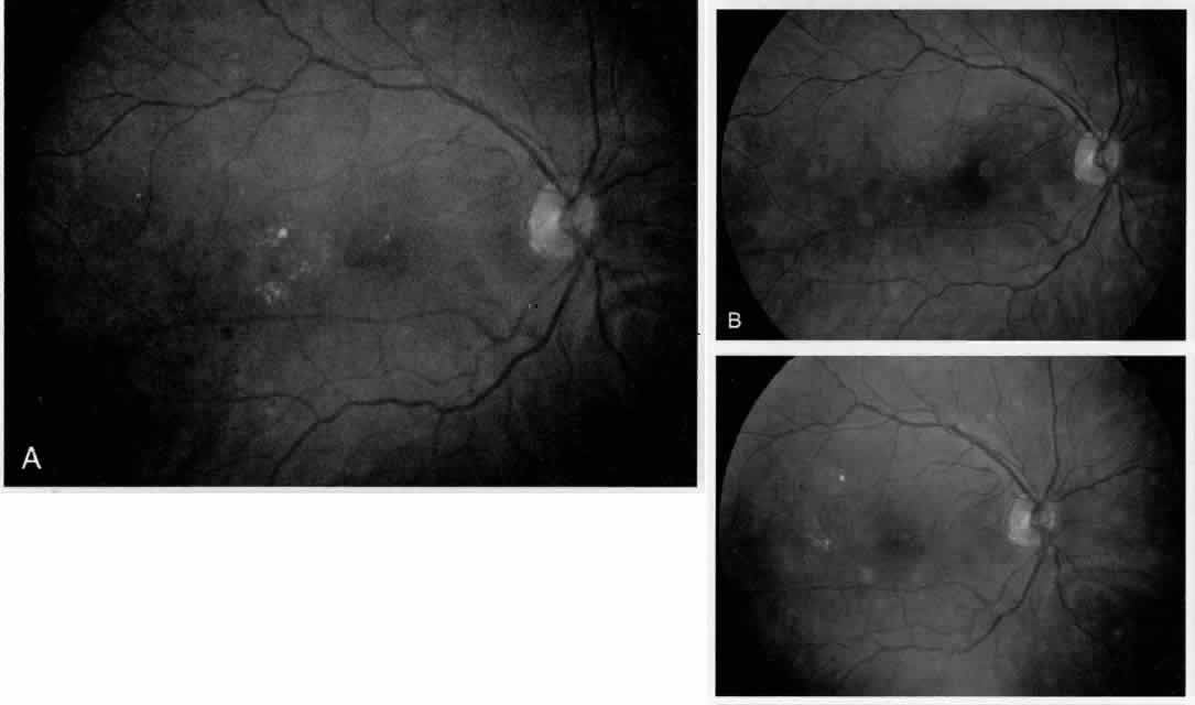 Supplemental macular treatment was required by the ETDRS if macular edema involved or threatened the center of the macula. Supplemental treatment was allowed for any degree of edema, which met one of the definitions for clinical significance.19,22,23 Fluorescein angiography is again useful in guiding the treatment once the clinical need for retreatment has been determined. Supplemental modified grid macular photocoagulation is recommended by Olk if residual central thickening involving the foveal avascular zone is seen on clinical examination.20,21,26 Only if retreatment is being considered does one obtain a fluorescein angiogram to delineate the areas of leakage, to identify the foveal avascular zone, and to guide in the pattern of treatment (Color Plate. 4, Fig. 4). |