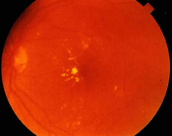 edema.15–21 The Early Treatment Diabetic Retinopathy Study (ETDRS)19,22–24 stated that patients with clinically significant macular edema be considered for treatment. They have shown that focal treatment substantially reduces the risk of visual loss from clinically significant diabetic macular edema regardless of initial visual acuity. Any of the following characteristics fulfills the definition of clinical significance: thickening of the retina at or within 500 μm of the center of the macula; hard exudates at or within 500 μm of the center of the macula, if associated with thickening of adjacent retina (not residual hard exudates remaining after disappearance of retinal thickening); or a zone or zones of retinal thickening one disc area or larger, any part of which is within one disc diameter of the center of the macula. The diagnosis of clinically significant macular edema is based on examination by stereo slit-lamp biomicroscopy and/or stereo fundus photography. Fluorescein angiography is not indicated to diagnose the presence of clinically significant macular edema. Angiographic evidence of fluorescein leakage without clinical evidence of retinal thickening does not fulfill the criteria for clinical significance. However, once the diagnosis and the decision to treat macular edema have been made, fluorescein angiography is extremely useful in helping to guide the treatment pattern. Angiography will identify treatable lesions and delineate the foveal avascular zone and the status of the macular perfusion. Fluorescein angiography will also confirm the presence of thickening and edema by leakage in the late stage of the angiogram, which also can be used as a guide to treatment (Color Plate. 2 ,Fig. 2).