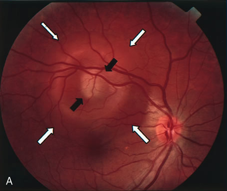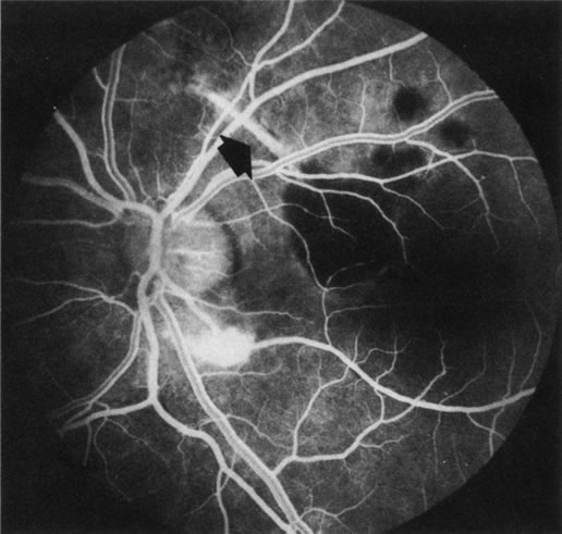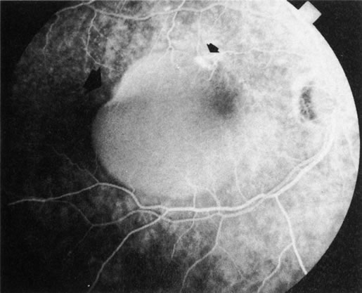 DIAGNOSIS Trauma can induce a wide spectrum of alterations of the retina, RPE, and choroid. Most types of traumatic maculopathy, such as Purtscher's retinopathy, Berlin's edema, retinal contusion, traumatic macular hole, and choroidal rupture, are readily apparent on clinical examination.257 Choroidal rupture, althoughe usually evident clinically, may be more obvious on FA (Fig. 39). Contusion necrosis of the RPE may present clinically with an associated RPE detachment, an overlying neurosensory detachment, and a subtle change in RPE pigmentation. FA can demonstrate the site of leakage into the subretinal space, unless the RPE defect has healed by the time of testing. FA is particularly helpful in differentiating retinal concussion (Berlin's edema), in which FA findings are normal, from retinal contusion, in which there is RPE damage and, consequently, increased transmission of choroidal fluorescence on FA.257 In Purtscher's retinopathy, FA can document vascular closure, which accounts for the retinal infarctions (Fig. 40).258