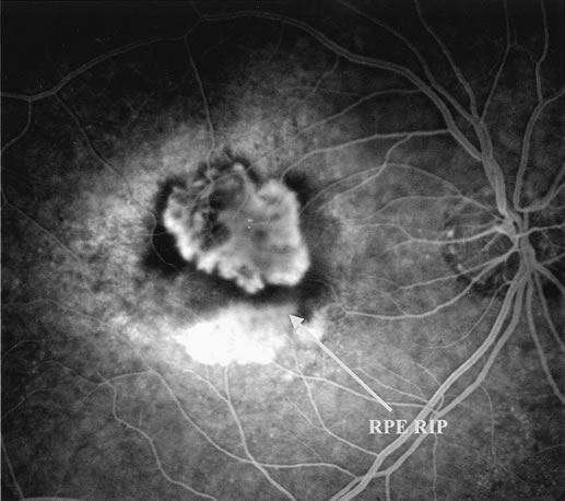 DIAGNOSIS Age-related macular degeneration (AMD) may be divided into two types. Nonexudative (“dry”) AMD has several morphologic forms, including “hard” discrete drusen, shallow retinal pigment epithelial detachments associated with thickened Bruch's membrane (“soft” drusen), and geographic atrophy (GA) of the retinal pigment epithelium (RPE).3 On FA the area of GA appears hyperfluorescent for window defect from the early frames of the angiogram, with late staining of the underlying sclera (Fig. 1). However, these pathologic changes can usually be assessed by clinical examination, and FA is generally not necessary to diagnose nonexudative AMD. An exception is cuticular drusen, which may appear clinically as a subtle disturbance of the RPE; FA reveals multitudes of small, discrete drusen described as “stars in the sky” (Fig. 2). The second type of AMD, which is associated with soft drusen, is known as exudative (“wet”) AMD. It is due to a choroidal neovascular membrane that has incompetent vessels resulting in detachments of the RPE and the neurosensory retina. Consequently, in patients with a large RPE and/or serous neurosensory detachment, FA is often necessary to rule out a choroidal neovascularization (CNV). In general, a small pigment epithelium detachment (PED) and a larger neurosensory detachment overlie CNV, while the opposite is generally the case in a nonexudative PED. Additionally, CNV often presents as a “notched” PED (Fig. 3).4 The presence of subretinal blood or pigment at the border of a PED strongly indicates that the detachment is exudative in origin (Fig. 4). Similarly, a rip in the RPE generally reflects subretinal fibrosis from a CNV (Fig. 5 and 6). The diagnosis is more difficult in patients who have a chronic, organized PED. Such a lesion may be due to either nonexudative AMD or to an organized, fibrotic CNV. Clinically and angiographically, it may be impossible to distinguish between these two conditions. In most cases, however, FA does assist in making the diagnosis.
