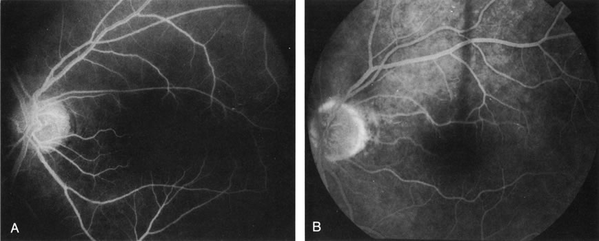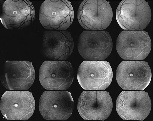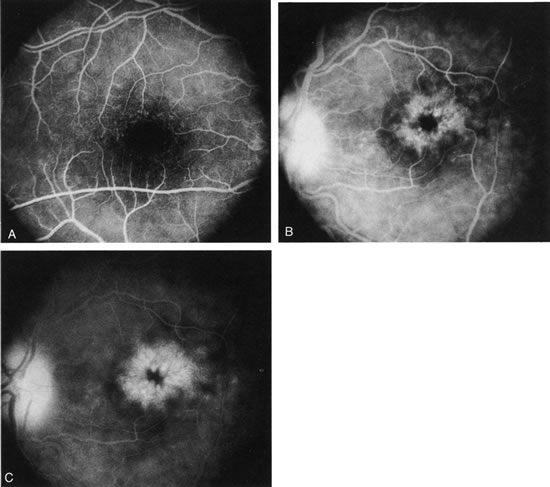 There are several conditions that may be confused with CME, including juvenile X-linked retinoschisis and Goldmann-Favre disease. FA can assist in making the diagnosis if it is not apparent on clinical examination. TREATMENT FA does not help guide treatment of CME, which should address the underlying cause. For example, posterior uveitis is generally managed with corticosteroids, wherease aphakic CME may benefit from steroid, antiprostaglandin, and acetozolamide therapy.240–250 FOLLOW-UP FA is often used to assess the response to therapy. Decreased fluorescein leakage can be a sensitive indicator of improvement, particularly when visual acuity is reduced to a level that makes subtle visual changes difficult to gauge. FA does not assist in prediction of the likely visual outcome. Although CME tends to resolve in some conditions, such as Irvine-Gass syndrome, patients with CME due to other causes such as diabetes generally suffer some irreversible loss of central vision. |