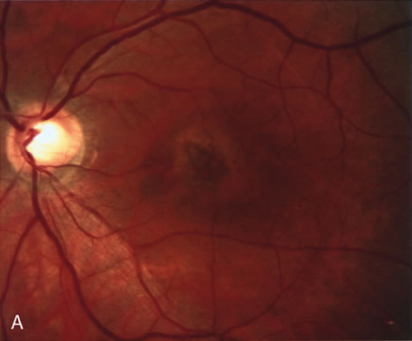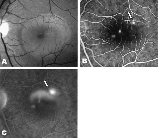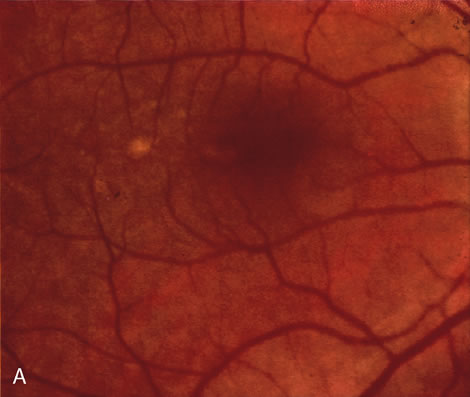 DIAGNOSIS The diagnosis of degenerative myopic maculopathy is clinically obvious. Patients with pathologic myopia are, however, at risk for development of CNV, and FA is helpful in their diagnosis and treatment.251–255 Patients with myopic degeneration have pigmentary changes that can be difficult to distinguish from small neovascular membranes. CNV in pathologic myopia tend to be smaller and less aggressive than the neovascular lesions of age-related macular degeneration.55 CNV in myopic eyes can often be strongly suspected on clinical grounds, using clues such as subretinal blood or lipid exudate, neurosensory elevation, and appearance of a gray membrane visible through atrophic RPE (Fig. 38). FA is sometimes helpful in distinguishing a neurosensory detachment due to a small macular hole from retinal elevation from leaking CNV. FA has been also valuable in demonstrating an association between Fuchs' spots and CNVs254 and in identifying disturbances of choroidal and retinal blood flow in pathologically myopic eyes.255