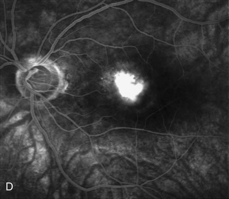 FOLLOW-UP FA is needed to assess response to laser photocoagulation of a CNV and to diagnose recurrent membranes.51,54 The authors generally obtain angiograms 2 weeks, 1 month, 3 months, and 6 months after treatment. The risk of recurrence is greatest during the first 3 months, and the patient, who often has decreased vision due to prior neurosensory detachment, may be asymptomatic. FA is also needed to evaluate the results of PDT. In the original protocol of the Verteporfin in Photodynamic Therapy (VIP) and Treatment of Age-Related Macular Degeneration with Photodynamic Therapy (TAP) studies, a fluorescein angiogram was obtained every 3 months, and if there was persistent leakage from the CNV PDT was applied again (see Fig. 18–20).60 |