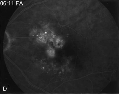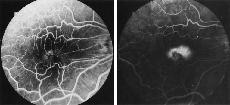 Conventional laser thermophotocoagulation is the treatment of choice for extrafoveal, well-defined, classic CNV. Photodynamic treatment (PDT) is the treatment of choice for subfoveal, predominantly classic CNV. FA is used to localize the lesion in relation to the fovea, classify the subtype, choose the type of procedure, and guide the treatment (Figs. 18, 19, and 20).56–73