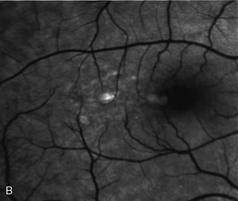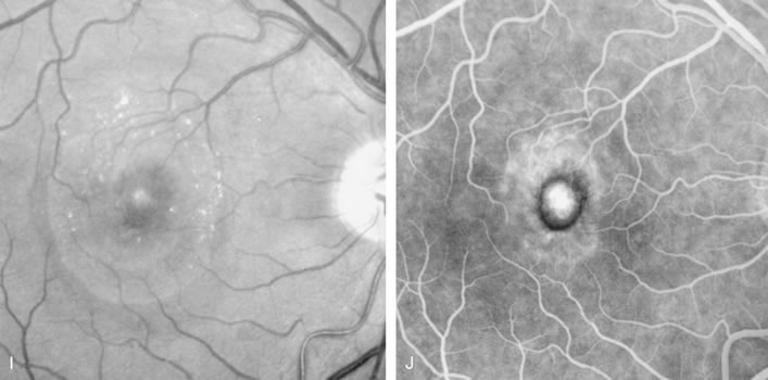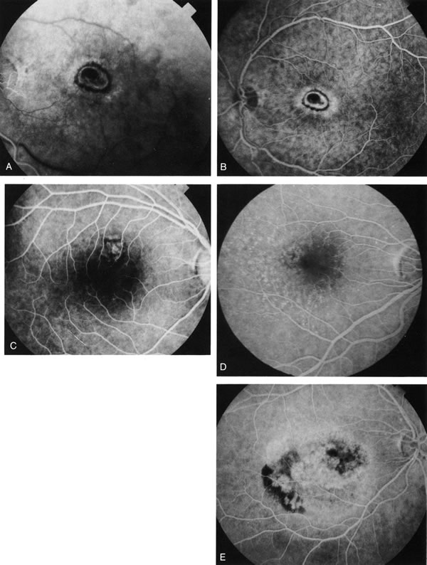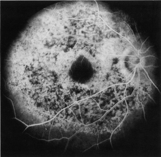 Oxalosis, which results from calcium oxalate deposition, can be due to an inborn metabolic disorder (primarily hyperoxaluria), ethylene glycol ingestion, or methoxyflurane general anesthesia.262–264 Clinically, patients have a crystalline retinopathy, and FA may show RPE hyperplasia, fibrous metaplasia, and choroidal neovascularization.55 Epinephrine induces CME that is generally diagnosed on clinical grounds. This condition occurs more commonly in aphakic patients. The maculopathy typically resolves with cessation of the drug, and FA can be useful to document resolution of the edema. Epinephrine-induced CME evidently increases retinal capillary permeability, but the pathophysiology of this process is poorly understood.265 Tamoxifen, an antiestrogen drug used in some cases of breast cancer, has a characteristic clinical picture.266 FA may reveal Tamoxifen-induced CME from capillary hyperpermeability and RPE alterations. Clofazimine is an antimycobacterial agent that has been used since 1962 to treat dapsone-resistant leprosy and, more recently, to treat Mycobacterium avium-intracellulare complex infection in patients with acquired immunodeficiency syndrome (AIDS). There have been two reports of bull's eye maculopathy with multiple RPE defects demonstrated on FA (Fig. 42).267,268