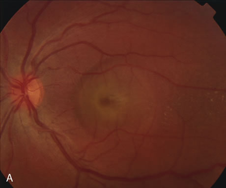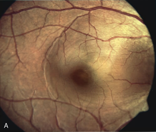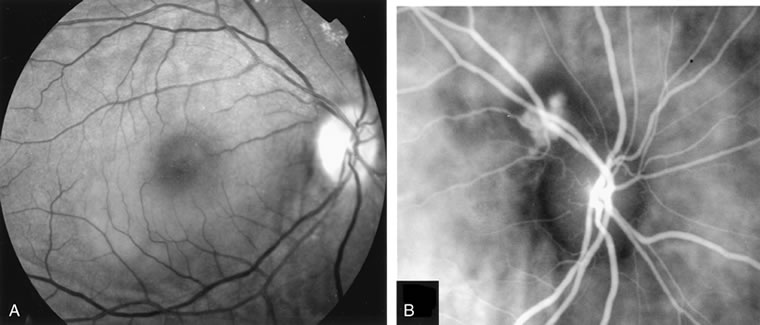 DIAGNOSIS In general, the diagnosis of a macular hole is readily made in patients who present clinically with a full-thickness retinal defect, yellow exudative deposits at the base, and, occasionally, an operculum. However, it is sometimes difficult, using contact lens biomicroscopy alone, to distinguish a full-thickness macular hole from simulating conditions. Visual acuity is often 20/200 to 20/400 in an eye with a full-thickness hole, whereas eyes with macular cysts or pseudoholes usually have better vision. Visual acuity, however, cannot rule in or rule out a full-thickness macular hole.213,214 The differentiation of a partial-thickness, or lamellar, macular hole from a full-thickness macular hole can be challenging, and FA is often helpful in assisting in the diagnosis.55 As in a full-thickness hole, a lamellar hole presents as an excavation of the retina, and the presence of drusen underneath the lamellar hole can simulate the yellow deposits seen at the base of full-thickness holes. Occasionally, there is a full-thickness hole at one side of a lesion, and the rest of the lesion consists of a lamellar defect. FA will show immediate hyperfluorescence from the choroidal circulation under a full-thickness hole (Fig. 34A), whereas a lamellar hole, with a relatively intact RPE, will block some of the normal fluorescence from the choriocapillaris (Fig. 34B).