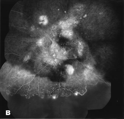 In patients with a shallow neurosensory detachment, the Amsler grid test and visual acuity may be normal. If there is subtle elevation of the neurosensory retina on biomicroscopy examination, FA may demonstrate a CNV before it is symptomatic. It is often easier to evaluate both RPE and neurosensory detachments with good stereoscopic FA pictures than with direct examination.5 Consequently, FA can be helpful in determining the presence and extent of these processes. This is particularly important in patients with CNV due to AMD, because its aggressive course often requires prompt intervention to save central vision.6,7 Furthermore, FA helps in recognizing two types of CNV: classic and occult. Classic CNV consists of a well-defined neovascular membrane, which is apparent in the early phase of the angiogram and shows late leakage of dye beyond its boundaries (Fig. 7 and 8). Occult CNV is seen on by FA as an area of late hyperfluorescence of undefined origin or as a neovascularized PED (Fig. 9 and 10 ). Mixed-type CNV is predominately classic or minimally classic depending on whether the classic component is more or less than 50% of the entire lesion (Fig. 11).