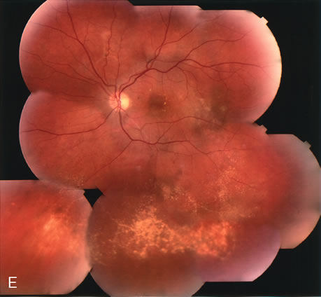 TREATMENT The value of treating CNV in highly myopic patients is controversial. The CNV generally does not grow extensively, there is considerable risk of rupturing Bruch's membrane, and the laser burn chorioretinal scar tends to enlarge substantially.251,252 Nevertheless, there is evidence that patients with pathologic myopia who receive treatment for CNV have better final visual acuity.243 FA often helps define the extent of CNV, but it has limited value in assisting the localization of the fovea. PDT has proved to be a useful option for the treatment of subfoveal CNV in myopia.256 FOLLOW-UP FA is useful in evaluating the efficacy of treatment of CNV and in determining whether recurrent CNV has developed. Patients with subfoveal CNV are likely to lose central vision. The diagnosis and prognosis of atrophic myopic degeneration is best determined by clinical appearance. |