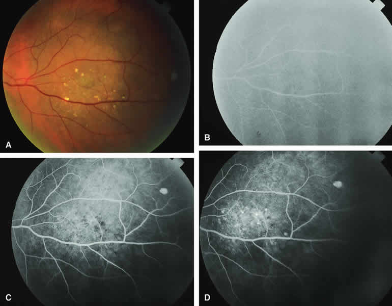 the fluorescein and ICG angiographic features of the following