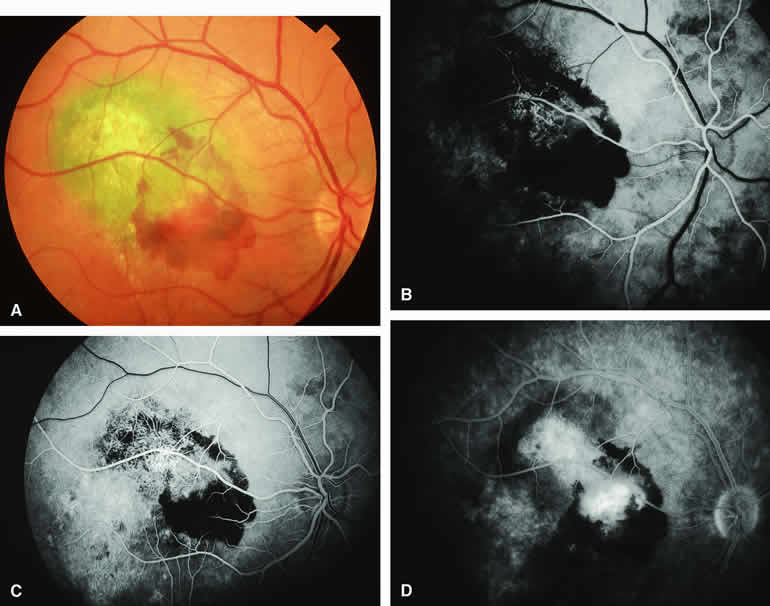Fluorescence Angiographic Detection of Lesion Enlargement Small melanocytic choroidal lesions in the nevus versus melanoma category are frequently monitored periodically following initial documentation for enlargement or other indicators of possible malignant behavior. Fluorescein angiography sometimes defines the basal area of these lesions better than does fundus photography, but ICG angiography is clearly the preferred technique for this purpose. If one elects to follow a small melanocytic choroidal tumor without treatment, comparative fluorescence angiography can be used to identify slight lesion enlargement that is not clearly evident by ophthalmoscopy or comparison of fundus photographs. Because benign choroidal nevi can and do enlarge, however, detection of subtle lesion enlargement by fluorescence angiography probably has limited differential diagnostic value in these lesions. CHOROIDAL MALIGNANT MELANOMA Choroidal malignant melanoma is the most common primary malignant intraocular neoplasm of adults. It has substantial local growth potential in addition to its well-known propensity to metastasize and, thereby, prove fatal to the host. Fluorescence angiography can provide evidence in support of the diagnosis of choroidal melanoma but is rarely if ever sufficient by itself to establish the diagnosis. Several ophthalmoscopically detectable features of clinically diagnosed melanocytic choroidal tumors are strongly indicative of their malignant potential. These include tumor diameter substantially greater than 7 mm, tumor thickness substantially greater than 3 mm, prominent intralesional large-caliber blood vessels, nodular apical eruption of the tumor through Bruch's membrane, invasion of the overlying retina by the tumor, and a prominent nonrhegmatogenous retinal detachment with shifting subretinal fluid. Several distinct fluorescein and ICG angiographic patterns have been associated with choroidal melanomas.1, 2, 3, 4, 5, 6, 7, 14, 15, 16, 17, 18, 19, 20, 21 These distinct patterns depend on the degree of pigmentation of the tumor cells, the thickness of the tumor, the presence or absence of eruption of tumor through the overlying Bruch's membrane, and the presence or absence of retinal invasion by the tumor. Melanotic Choroidal Melanoma Without Invasive Features The typical choroidal melanoma that has not broken through Bruch's membrane generally appears as a gray-brown to dark brown, dome-shaped, solid choroidal mass (Fig. 9A). The overlying retina commonly appears normal except that it is draped over the choroidal tumor. Fluorescein angiography (see Fig. 9B, C, and D) typically shows the tumor to be relatively hypofluorescent during the early frames of the study. If prominent clumps of orange lipofuscin pigment are present on the surface of the tumor, they will appear intensely hypofluorescent throughout the study because of blockage of the underlying choroidal and tumor vascular fluorescence. During the arterial phase frames of the study, several ill-defined large-caliber deep intralesional blood vessels may be identifiable against the generally hypofluorescent background. As the study continues, these large intralesional blood vessels leak progressively so that the surface of the lesion tends to appear hyperfluorescent by the late frames. Fluorescein may also accumulate in the overlying retina and retinal pigment epithelium as tiny discrete pinpoint foci of intense hyperfluorescence. If serous retinal detachment is present overlying and around the tumor, the fluorescein will leak through the retinal pigment epithelium and accumulate in the subretinal fluid by the late frames. The retinal vascular pattern of the overlying retina commonly appears unremarkable in these cases. If ICG angiography is performed on a similar tumor (Fig. 10), the tumor mass generally appears more intensely hypofluorescent throughout the study and its intrinsic blood vessels appear more clearly visible than on fluorescein angiography. ICG slowly accumulates within the extracellular space of the tumor so that the tumor usually appears mildly hyperfluorescent, at least in part, in the late frames. Amelanotic Choroidal Melanoma Without Invasive Features If the choroidal melanoma being evaluated is relatively amelanotic (Figs. 11A and 12A), its large-caliber intralesional blood vessels will tend to show up more distinctly on both fluorescein angiography (see Fig. 11B, C, and D) and ICG angiography (see Fig. 12B, C, and D) than they would in a darkly melanotic choroidal melanoma. Despite its amelanotic color, the cellular component of the mass tends to be at least mildly hypofluorescent relative to the adjacent uninvolved choroid during the early frames of the study. As with melanotic melanomas, the mass usually appears at least mildly hyperfluorescent in the late-phase frames (see Figs. 11D and 12D). Choroidal Melanoma With Nodular Eruption Through Bruch's Membrane If a choroidal melanoma has erupted through Bruch's membrane (Figs. 13A and 14A), it forms an apical nodule that is generally hypomelanotic and contains many large-caliber blood vessels. Fluorescein angiography of these tumors (see Fig. 13B, C, and D) typically shows hypofluorescence of the base of the lesion during the early frames, relatively rapid filling of the prominent blood vessels in the apical nodule during the venous and recirculation frames, and intense late staining of the apical nodule resulting from progressive fluorescein leakage by the late-phase frames. Similarly, ICG angiography of these tumors (see Fig. 14B, C, and D) also shows relative early hypofluorescence of the tumor base, early filling of prominent intralesional blood vessels within the apical nodule, intense staining of the apical nodule by the recirculation phase frames, and persistent late hyperfluorescence of the mass. Choroidal Melanoma with Retinal Invasion Occasional choroidal melanomas develop darkly melanotic patches of retinal invasion on their surface. These 