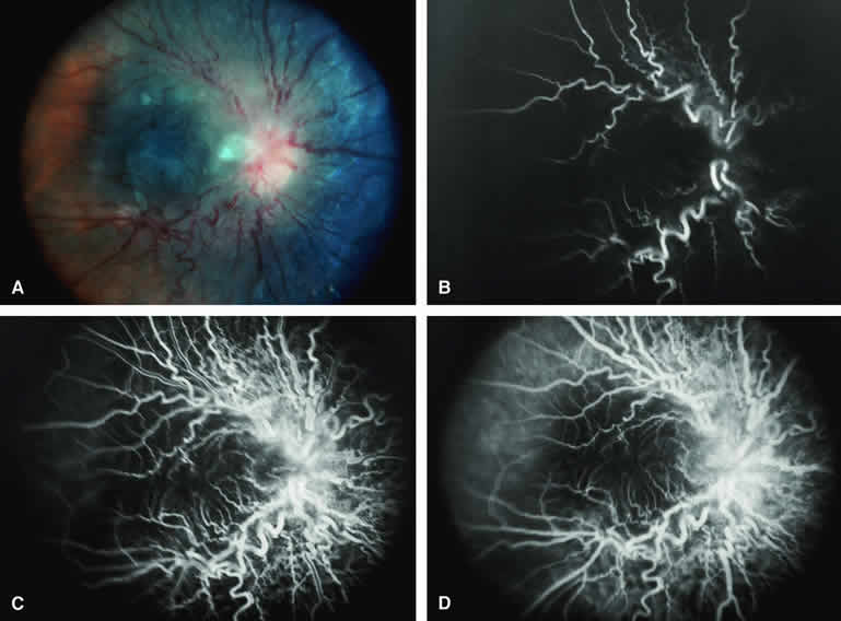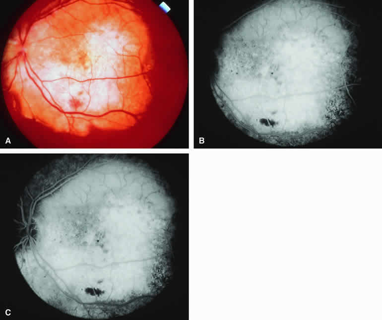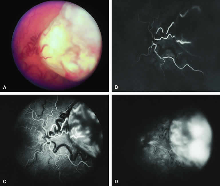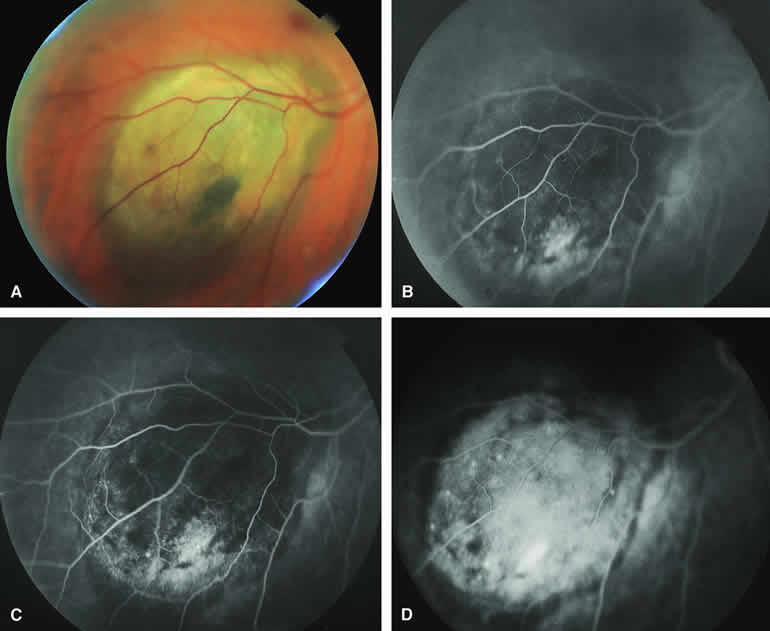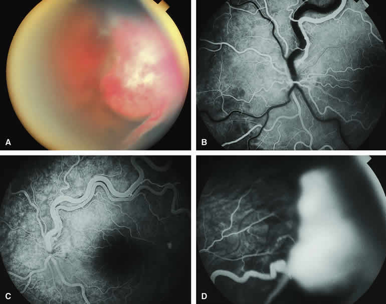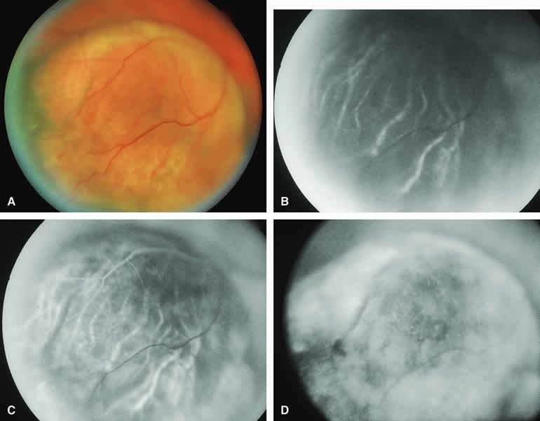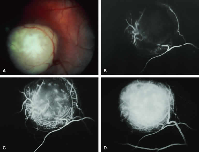 are mentioned in this section. RETINOBLASTOMA Retinoblastoma is the most common primary intraocular malignancy in children. It is usually a unilateral, unifocal, sporadic disease, but a substantial proportion of affected children have multifocal, bilateral, genetic retinoblastoma. A typical discrete retinal tumor in retinoblastoma appears as an opaque white retinal mass with prominent small-caliber surface blood vessels and dilated tortuous afferent and efferent retinal shunt vessels (Figs. 26A and 27A). Unfortunately, most children with retinoblastoma present at a much more advanced intraocular extent of disease, exhibiting leukocoria resulting from the bulk of white tumor filling the vitreous chamber. Because retinoblastoma usually affects young children, fluorescein angiography must be obtained during examination under anesthesia in most cases. Performing a fluorescein angiogram on an intubated infant or small child requires a fundus camera that is mounted vertically on a mobile base or special positioning of the child.32 Fundus fluorescein angiography is rarely, if ever, helpful in the diagnosis of retinoblastoma. If one can visualize the fundus adequately by ophthalmoscopy and can identify discrete white retinal tumors supplied by and drained by retinal blood vessels, fluorescein angiography provides no essential additional information that establishes or refutes the diagnosis of retinoblastoma. The only true solid tumor that strongly resembles retinoblastoma, the retinal astrocytic hamartoma, usually does not have associated dilated and tortuous retinal blood vessels or the degree of surface vascularity that one expects with retinoblastoma. Discrete Intraretinal Retinoblastoma If fluorescein angiography is performed on a discrete intraretinal retinoblastoma (see Figs. 26B, C, and D and 27B, C, and D), the angiogram typically shows rapid filling of the feeding retinal artery, prompt filling of the intralesional capillaries within a second or two, and rapid subsequent filling of the draining retinal vein.32 The intralesional capillaries tend to leak fluorescein, so the tumor characteristically stains brightly in the late frames. However, intraretinal retinoblastoma lesions typically do not show substantial fluorescein leakage into the overlying vitreous. Larger intraretinal retinoblastomas are typically associated with multiple dilated and tortuous feeding retinal arteries and draining retinal veins (Fig. 28A). Fluorescein angiography of this tumor (see Fig. 28B, C, and D) shows rapid filling of the feeding arteries, rapid subsequent filling of intralesional blood vessels, and relatively quick filling of all draining retinal veins. In the later frames, it exhibits intense hyperfluorescent staining. Advanced Intraocular Retinoblastoma Presenting as Leukocoria In cases of total leukocoria in which one cannot discern a distinct tumor, fluorescein angiography documents the visible vascular abnormalities in the detached retrolental retina (exophytic growth pattern) or the absence of vessels in the fluffy retrolental tumor (endophytic growth pattern) but is not otherwise of diagnostic value. Regressed Intraretinal Retinoblastoma Following Radiation Therapy If retinoblastoma is managed by radiation therapy, the tumors commonly regress to calcified (type I) residual nonviable lesions. In some cases, however, a substantial fish flesh (type II) regression pattern accompanies a partially calcific response. Although the entire tumor or portion that exhibits this regression pattern typically appears more grayish and less vascular than untreated viable tumors, this distinction is occasionally difficult to make by ophthalmoscopy. In these situations, fluorescein angiography may be helpful in distinguishing between residual viable tumor and satisfactory type II regression. If the tumor is regressed in a type II pattern, fluorescein angiography typically shows the afferent and efferent retinal vessels to be much less prominent than they were before treatment, the residual intralesional vasculature to be markedly diminished or absent, and late staining to be mild. Regressed Retinoblastoma Following Chemotherapy The first-line management of many children with retinoblastoma today is chemotherapy rather than radiation therapy. Retinoblastomas that have regressed completely following chemotherapy exhibit few if any residual patent intralesional blood vessels and limited late hyperfluorescence. In contrast, retinoblastomas that remain viable and likely to relapse locally tend to have some persistent intralesional blood vessels that can show up prominently on fluorescein angiography. Regressed Retinoblastoma Following Photocoagulation or Laser Therapy Following successful photocoagulation or laser therapy of localized retinoblastoma, the entire treated site should appear flat and atrophic. If there is any question about residual tumor, fluorescein angiography may be helpful. If the lesion is indeed fully regressed, there should be no residual abnormal vasculature within the central portion of the lesion. If even a small amount of residual viable tumor is present, one will often note an irregular vasculature corresponding to that lesion and late staining of that portion. A fluorescein angiogram showing these features is probably an indication for supplemental tumor treatment. RETINAL ASTROCYTIC HAMARTOMA The retinal astrocytic hamartomas is a benign neoplasm derived from intraretinal astrocytes. The typical lesion becomes evident in childhood or early adulthood. This lesion is a frequent feature of tuberous sclerosis, but some patients develop an astrocytic hamartoma of the retina in the absence of other features of this syndrome. Typical Retinal Astrocytic Hamartomas in Tuberous Sclerosis Typical retinal astrocytic hamartomas associated with tuberous sclerosis appear as translucent patches, opalescent spots, or opaque white retinal tumors33,34 (Figs. 29A and 30A). Affected people often have more than one l