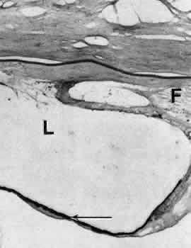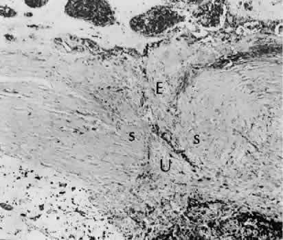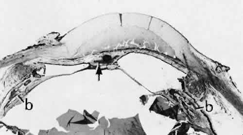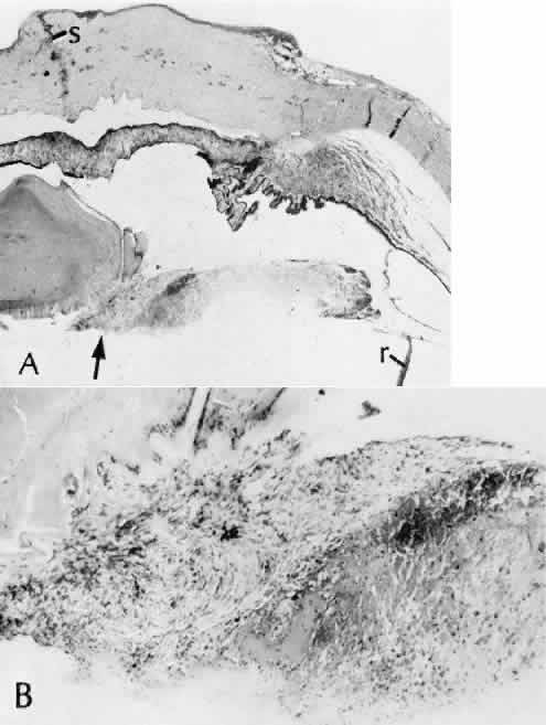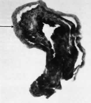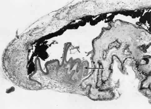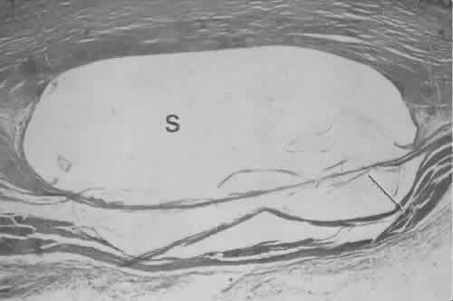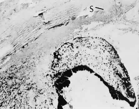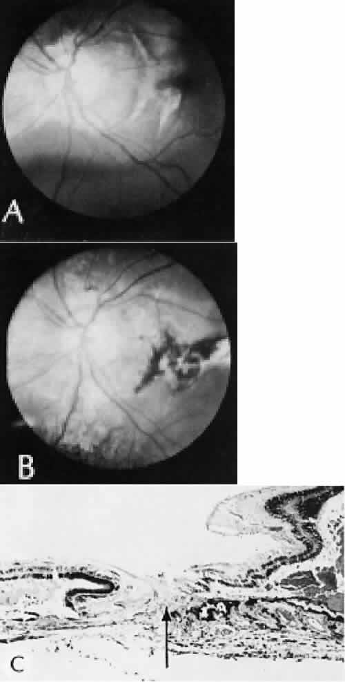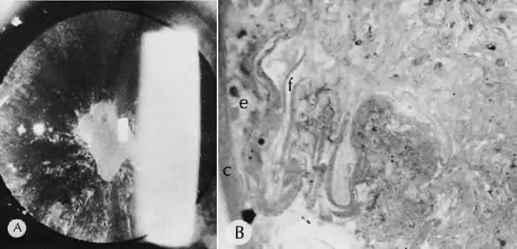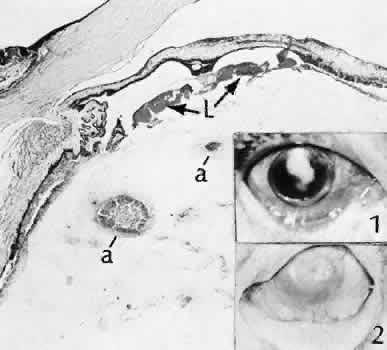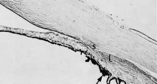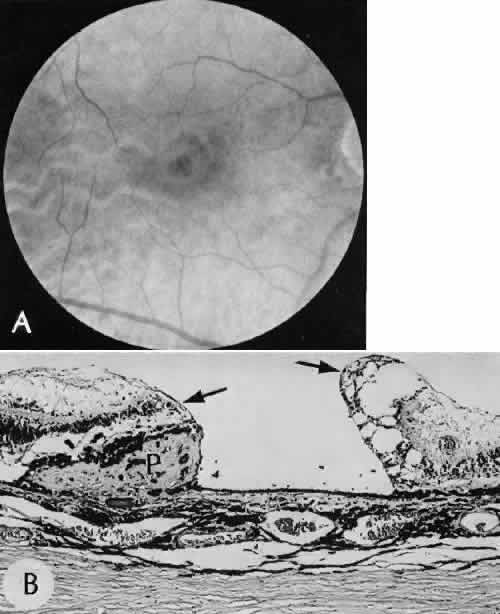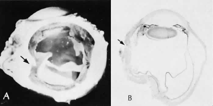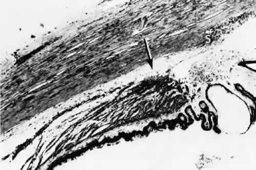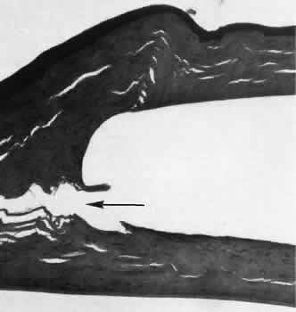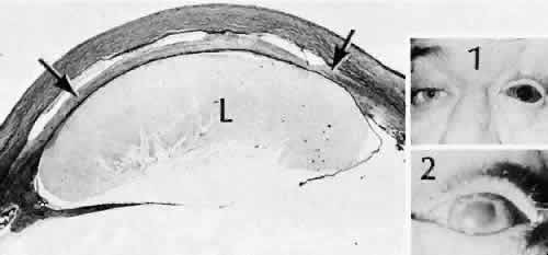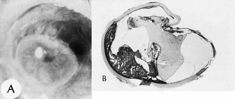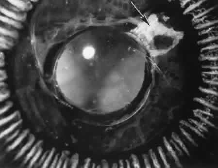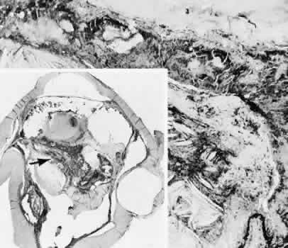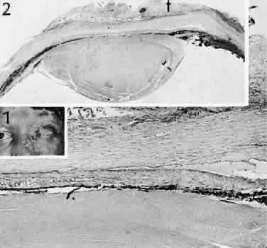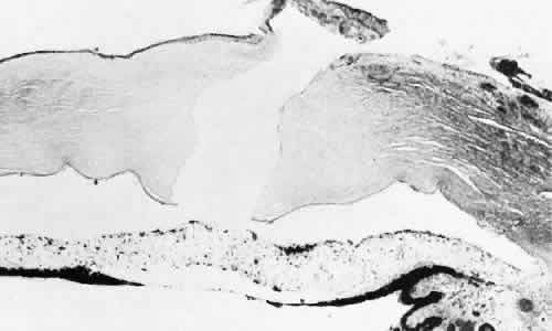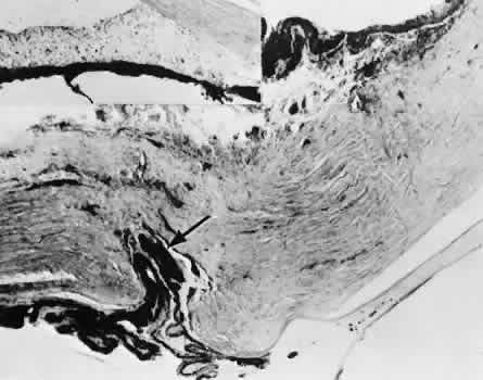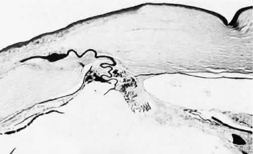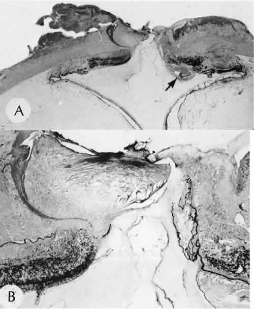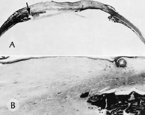 for more effective therapeutic intervention.86 Many complications originate from so-called surgical confusion (Fig. 24). Most arise from a lack of knowledge, a lack of judgment, or problems in perception. At times, lack of attention to detail in preoperative planning may lead to a drug reaction, inadequate anesthesia, misplacement of incisions and sutures, or a patient who is unable to control a cough reflex. What is recognized histologically as the immediate cause of the problem may well have its origin in improper planning of the procedure. CATARACT EXTRACTION Intraoperative Complications Complications occurring from the time the patient enters the operating room until the patient leaves the operating room are considered intraoperative.87,88 Misplacement of an anterior segment incision too far anteriorly into the cornea may create an unacceptable degree of scarring or astigmatism, whereas misplacement too far posteriorly (Fig. 25) may cause the incision to enter the ciliary body instead of the anterior chamber, an especially serious event in glaucoma filtering procedures. Misplacement oflimbal sutures (Fig. 26) may cause anterior wound gaping if placed too far posteriorly or posterior wound gaping if placed too far anteriorly. A deep suture may enter the anterior chamber and lead to wicking and a flat anterior chamber postoperatively. A suture placed at different depths in the two sides of the wound results in faulty apposition of the wound edges. Descemet's membrane is only loosely adherent to the posterior stroma and may be stripped into the anterior chamber at the time of the corneal incision placement (Fig. 27) or injection of sodium hyaluronate. Splitting off of Descemet's membrane from the posterior cornea can lead to postoperative intractable corneal edema.89,90 Intraoperative anterior chamber hemorrhage may result from an inadvertent iridodialysis or from the iridectomy wound. The site of hemorrhage is usually found along the scleral side of the cut edge of the wound. This type of hemorrhage rarely leads to serious clinical problems.91 Rupture of the posterior lens capsule (Fig. 28) increases the risk of vitreous loss and limits options for the implantation of an intraocular lens. Retention of lens capsular tissue or vitreous in the wound (Fig. 29) will significantly delay the wound healing process. Vitreous loss leads to an increased incidence of iris prolapse, bullous keratopathy, epithelial downgrowth, stromal overgrowth, wound infection and endophthalmitis, updrawn or misshapen pupil, vitreous bands, postoperative flat anterior chamber, secondary glaucoma, retinal detachment, cystoid macular edema, optic disc edema, vitreousopacities, vitreous hemorrhage, and other sight-threatening consequences.92 Damage to the endothelium during insertion or positioning of the lens was one of the most common problems with intraocular lens implantation until the widespread use of intraoperative viscoelastics. The endothelial cell damage may manifest on the first postoperative day as corneal edema. The course of the edema may wax and wane and ultimately result in pseudophakic bullous keratopathy months or years after surgery. Detachment of Descemet's membrane, inadvertent iridodialysis, cyclodialysis, or rupture of the posterior capsule also may occur during lens insertion and positioning. Expulsive choroidal hemorrhage (Fig. 30) is a rare catastrophic complication often resulting in total loss of the eye.93 The site of hemorrhage is probably a sclerotic choroidal arteriole where the vessel crosses the suprachoroidal space from the scleral canal. The sudden hypotension after surgical penetration of the globe causes a bending and then a rupture of the arteriole.94 Although most hemorrhages are massive and immediate, they occasionally are delayed, and some may not occur for days or weeks after surgery. Delayed choroidal hemorrhage may occur at the time of corneoscleral suture removal,95 because of clinically unapparent wound dehiscence or as a result of perforation of a corneal ulcer. Histologically, massive choroidal hemorrhagic detachment is associated with a retinal detachment. The retina and choroid may herniate through the scleral wound. A ruptured ciliary artery may be found in the suprachoroidal space. Postoperative Complications Postoperative complications may arise from the time the patient leaves the operating room until approximately 6 weeks after surgery.96 A flat anterior chamber is characterized by anterior displacement of the iris to near or in actual contact with the posterior surface of the cornea. The most common cause is leakage of aqueous along one of the suture tracks. Prolonged decompression of the anterior chamber increases the risk of synechiae formation and intractable secondary closed-angle glaucoma. Corneal endothelial damage may result in bullous keratopathy. Choroidal edema (choroidal hydrops or detachment) (Fig. 31) may be associated with a flat anterior chamber and may potentiate the condition. The choroidal edema will slow or stop aqueous production by the ciliary body, further delaying reformation of the anterior chamber. The histologic characteristics of choroidal edema consist of spreading of the choroidal tissue in a fanlike configuration and eosinophilic fluid filling the intervening spaces. The edema fluid may be lost in processing, leaving multiple apparently empty spaces. Iris or lens capsular incarceration into the wound and extending to the conjunctival space (Figs. 32 and 33) may act as a wick through which aqueous can escape, causing a flat anterior chamber. Histologically, iris, which is frequently recognized only by the presence of melanocytes, is seen in the limbal scar, in the limbal episclera, or in both areas. Vitreous wick syndrome consists of vitreous incarceration in the wound, where the vitreous may extend beyond the wound to the subconjunctival space or occasionally to the ocular surface.97 Anchoring of the vitreous anteriorly in this man